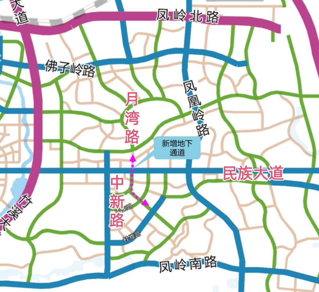 根据规划,民族大道将新增下穿通道,北接月湾路,南连中新路,双向4车道,通道两侧设有非机动车道、人行道。