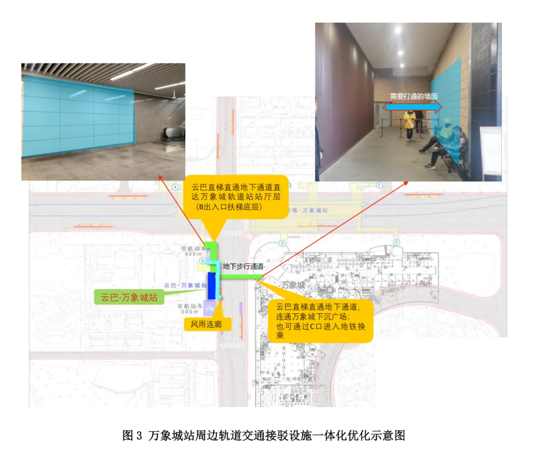 ▲万象城站周边轨道交通接驳设施一体化优化示意图