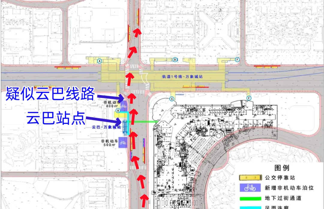 如图所示,“云巴-万象城站”为蓝色方块,其位置在万象城商场的对面,且《规划》透露该云巴站点可“直梯上下”连接地下的地铁站,也有地面上的“风雨连廊”。