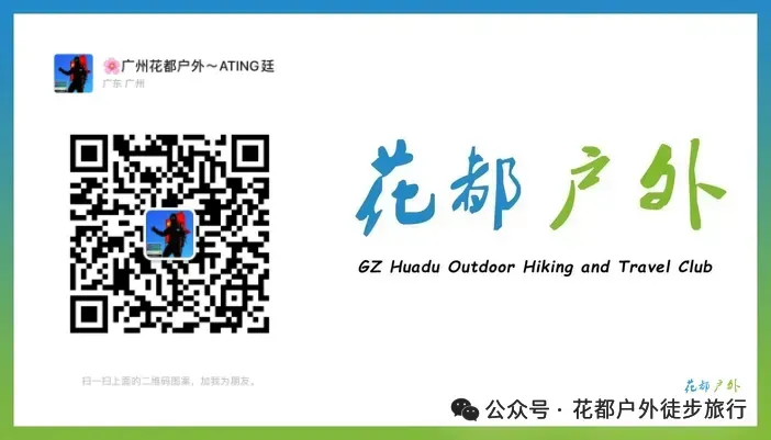 报名缴费、或有对行程有疑问顾虑和对其他活动感兴趣的,欢迎致电咨询“小北客服xiaobei13602260169”或俱乐部负责人“领队ATing阿廷18977596479、领队阿朝AChao17576028389”,请认准俱乐部旗帜:花都户外(广州市花都区最有影响力户外俱乐部之一),添加好友请注明来意“徒步”或“旅行”“合作”,报名成功后,请主动添加小北客服或俱乐部负责人~领队阿廷,说明来意,加入群聊,活动具体安排、通知、照定位等相关信息将会及时发送