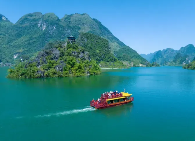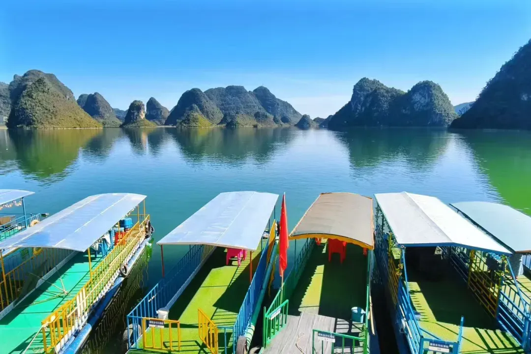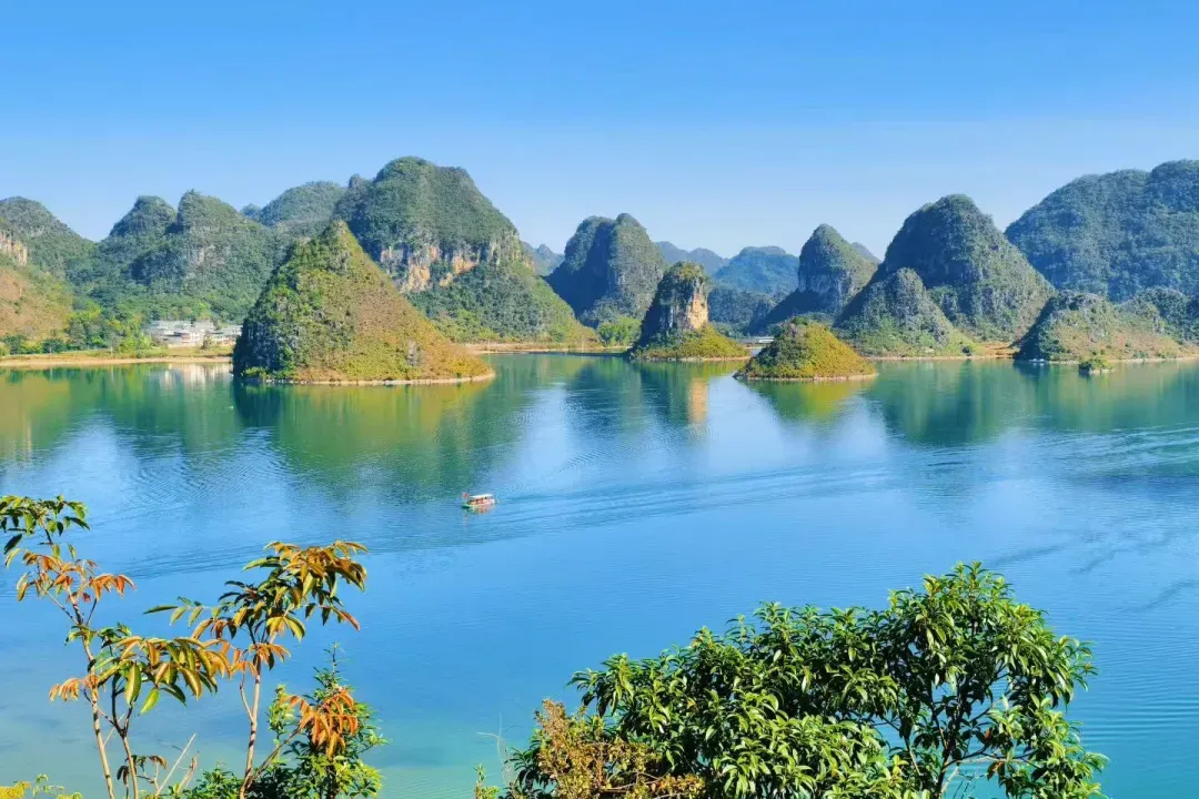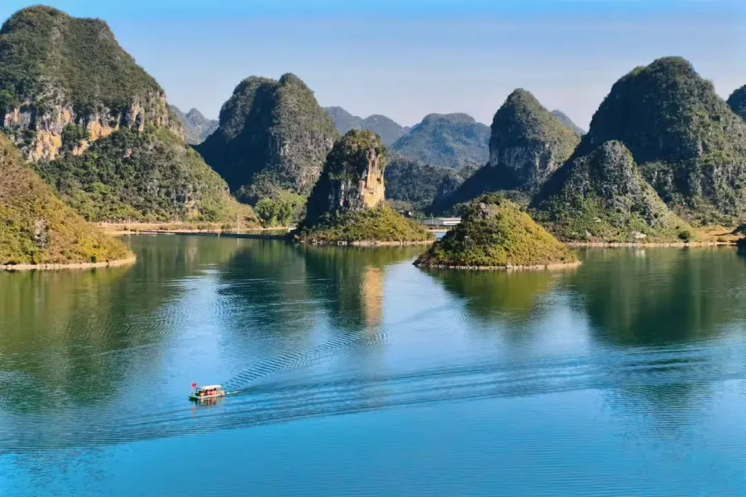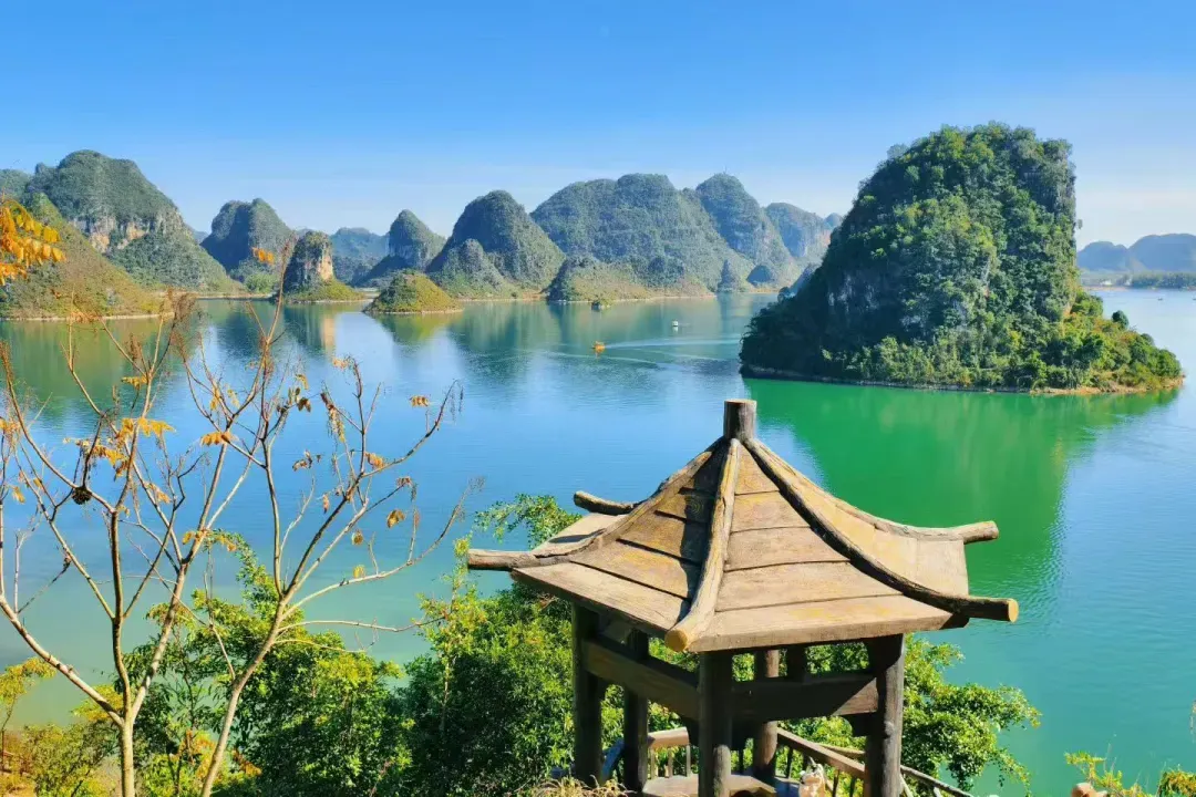 早餐后游览广西版的纳木错——【浩坤湖风景区】:湖面面积约20平方公里,湖面宽阔,水质清澈,四周山峦起伏,连绵不断,湖中独峰耸立,小岛显露,自然风光十分优美。湖边聚居壮、瑶少数民族,民俗风情独特。