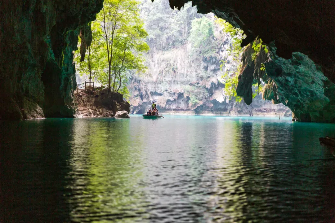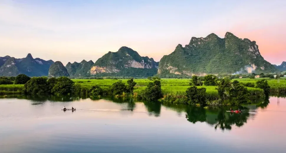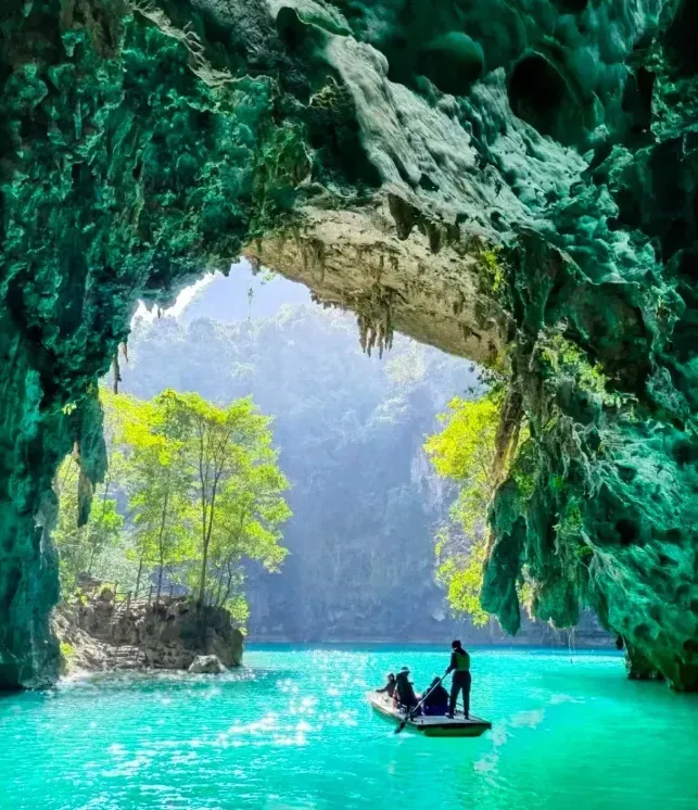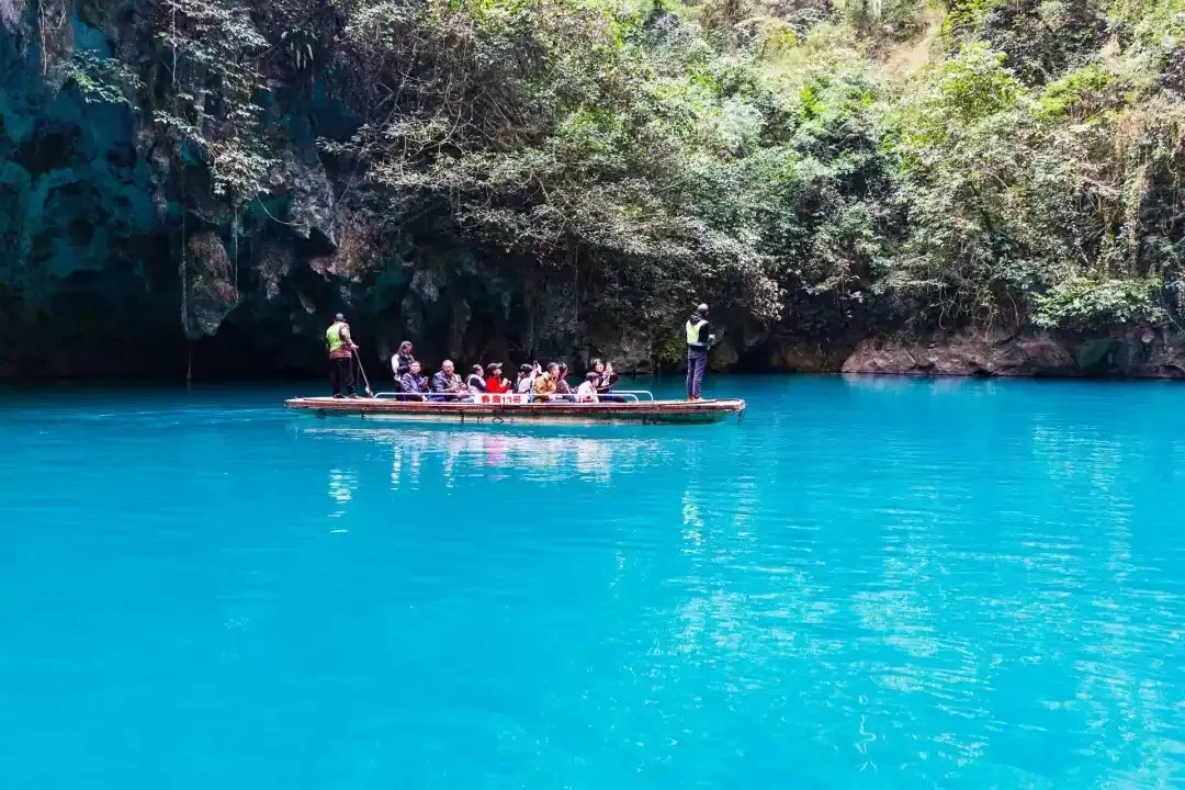 三门海并非真正的海,而是世界罕见的水游天窗洞穴群。由六个地下溶洞大厅组成,其中三个可乘船穿越,阳光从头顶的“天窗”倾泻而下,照亮碧绿的水面,宛如漂浮在空中。乘船穿行其间,仿佛进入潘多拉星球,四周静谧如诗,水声回响,是地质奇观与光影艺术的完美结合。每一“门”都形态各异,有的开阔如湖,有的狭窄如廊,船行其中,光影变幻,美得令人屏息。这里是摄影、冥想、探险的理想之地,也是桂西喀斯特地貌的巅峰之作。
