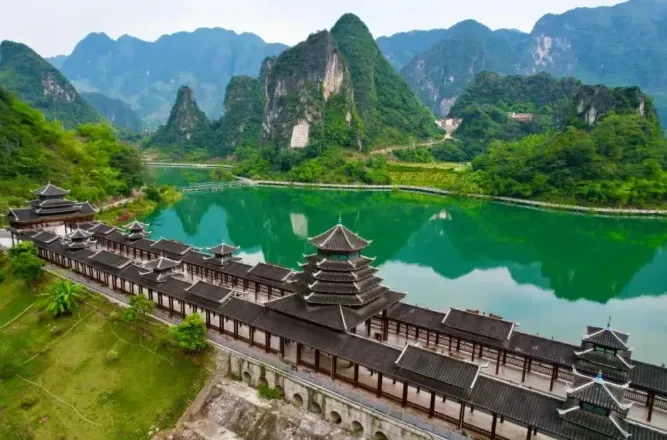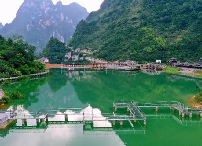 几十座高耸的喀斯特峰林围起来的浩坤湖,犹如一块巨大的翡翠,湖中岛屿星奇罗布,水天一色,群山尽数倒映在水中,宛如水中还有另外一个世界一般。如此醉人的湖光山色,更是入选了《中国国家地理》杂志,评出的“广西100个最美观景拍摄点 ”。网红打卡,随手出片,玻璃桥、三合鱼仙亭、湖心岛、风雨桥怎么拍都美!