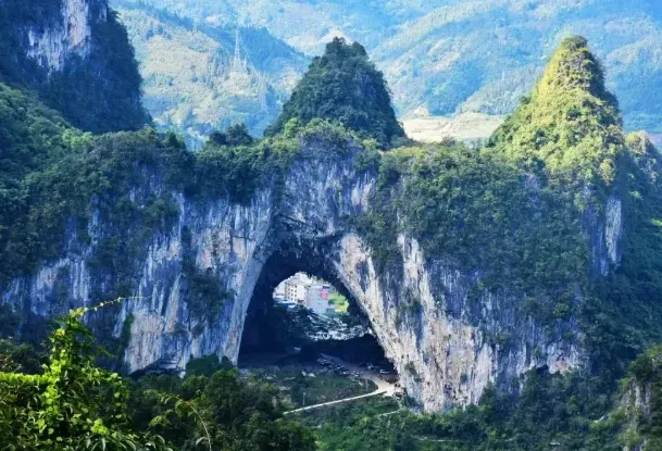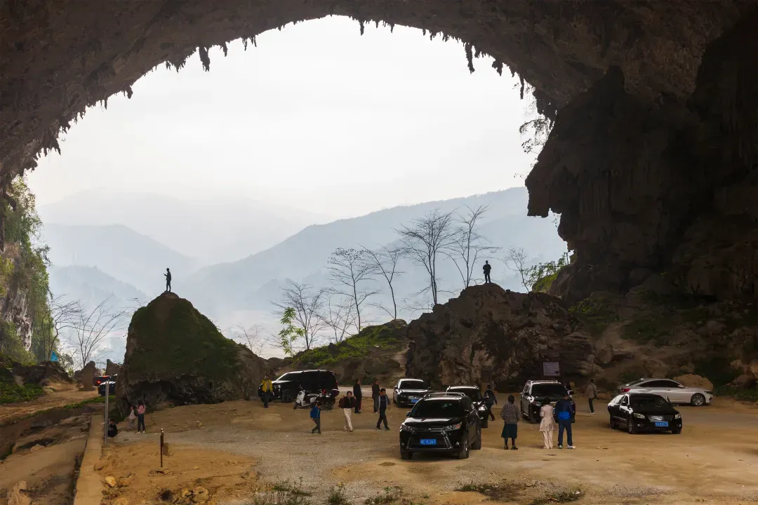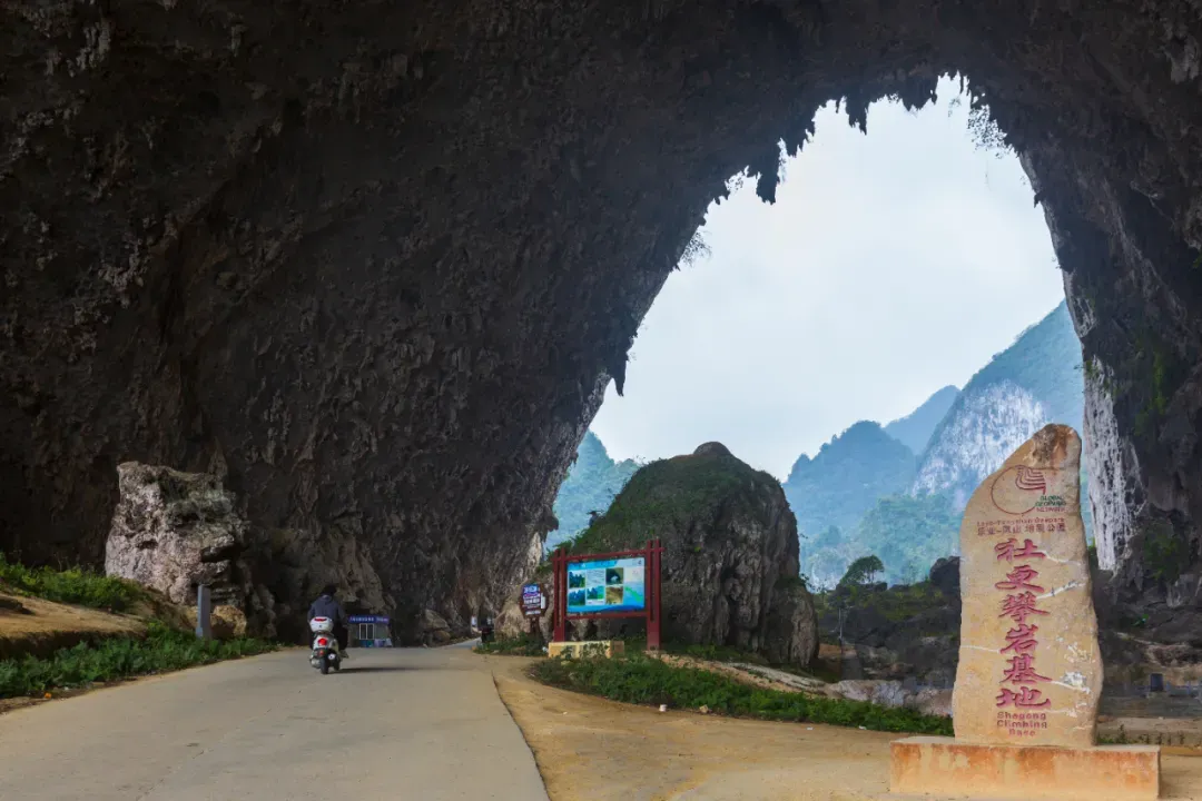 后前往2公里外的【社更穿洞】打卡:它处于广西凤山三门海东北侧社更那孟屯南侧山坡上,穿洞天坑呈多边形,洞口高480米,高出坡心谷地50米,有社更到弄残(地名)简易公路穿过,穿洞长239米,宽78-142米,高60-76米,洞顶厚度为25-100米。因大巴车无法通过穿洞,需要提前下车步行一段后才能参观,望亲们知晓。