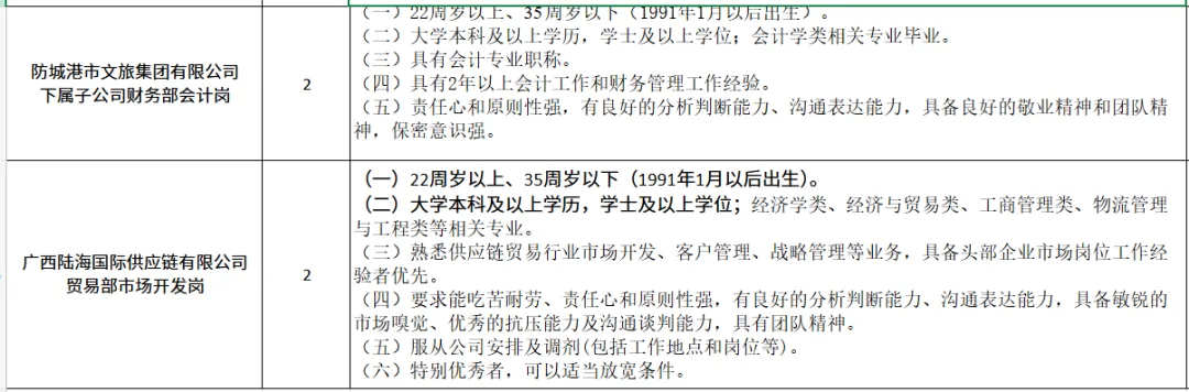 防城港市文旅集团有限公司为防城港市人民政府直属国有企业。根据“管委会+公司”体制机制改革部署,2020年12月完成公司与防城港市江山半岛旅游度假区管理委员会合署办公,实行“一套班子,两个机构”。自2019年实施国企改革和整合重组以来,经过多年稳健发展,形成以文旅康养为核心主业,以商贸物流、保税产业、能源产业、现代农业为重要支撑的“1+4”产业发展格局。公司资产达215亿元,注册资本25亿元。下属全资子公司15家、控股子公司5家、参股子公司3家、社会组织1家。 防城港市文旅集团有限公司本次拟公开招聘3个岗位,5名员工,即集团公司财务管理部融资岗1名,集团下属二级子公司财务部会计岗2名,集团下属广西陆海国际供应链有限公司贸易部市场开发岗2名。具体岗位要求详见《防城港市文旅集团有限公司2026年(第1期)面向社会公开招聘职位表》(详见附件1)。1.具有中华人民共和国国籍,遵守宪法和法律法规,品行端正,诚实守信,具有良好的职业道德,无违法乱纪行为及不良记录。2.具有岗位工作所需要的学历、专业和能力,服从工作安排,具有较强的事业心和责任感,具备招聘岗位所需要的其他资格条件。3.身体健康,符合国家《公务员录用体检通用标准(试行)》中规定的健康体检标准及行业的健康标准要求。经研究确定聘用且考察、体检合格的,由招聘单位与聘用人员签订劳动合同,为聘用人员购买“五险一金”。试用期及聘用期间的工资、福利等待遇按招聘单位薪酬制度执行。1.防城港市文旅集团有限公司2026年(第1期)面向社会公开招聘职位表 3.防城港市文旅集团有限公司2026年(第1期)公开招聘报名人员一览表由于篇幅有限