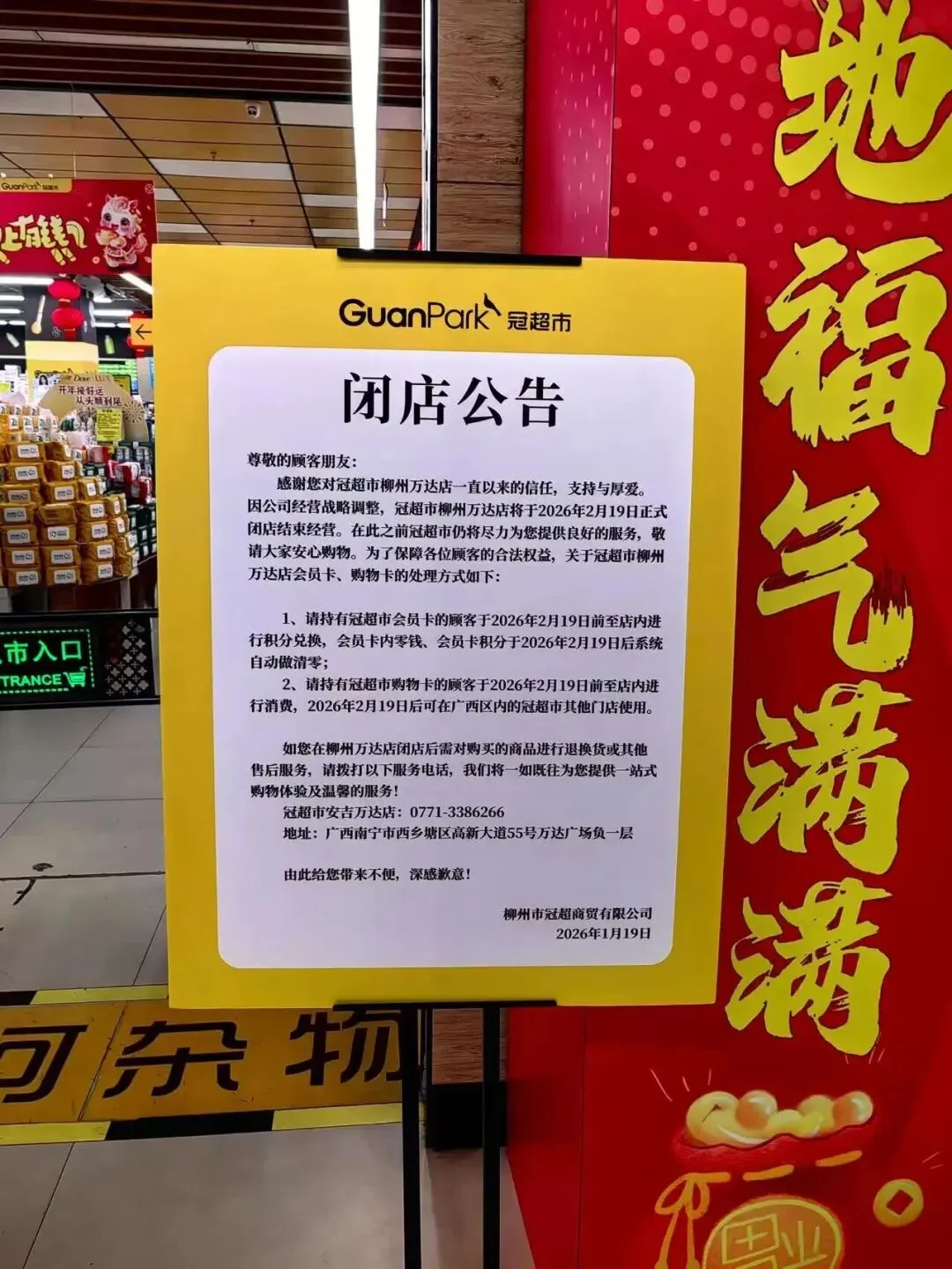1月19日,柳州城中万达冠超市发布《闭店公告》,因经营战略调整,该店将于2026年2月19日闭店。持购物卡顾客需2月19日前消费,之后仅限广西其他门店使用;会员卡积分、零钱届时清零。目前该店经营正常,未打折促销。值得注意的是,该店去年4月重装升级,至今不足一年。其2015年随万达开业,已有十年历史。闭店消息引发热议,有人要抓紧消费,有人蹲打折,还有人感慨实体经济艰难。