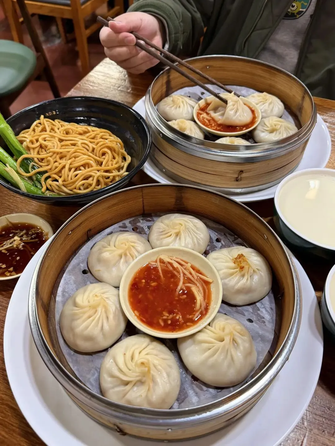我的固定搭配永远是“汤包+葱油面+现磨豆浆”!葱油面的面条筋道爽滑,裹着秘制的酱油酱汁和足量的葱油,咸香入味,每一根面条都裹满香气,嗦起来太过瘾。现磨的豆浆没有加糖,保留了黄豆最本真的醇厚,口感绵密顺滑,喝一口解腻又暖胃,三者搭配,咸香、鲜香、豆香交织在一起,味蕾直接原地起飞。