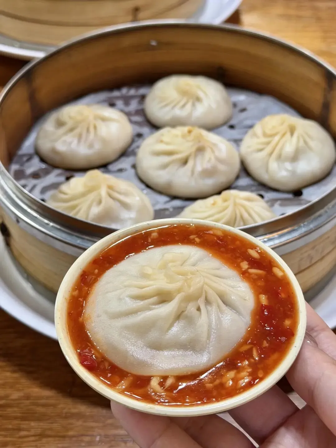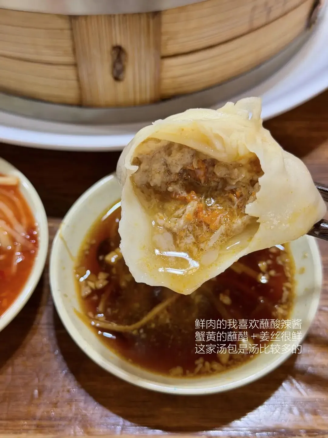 等上5分钟,一笼热气腾腾的汤包就端上桌了!皮薄得能透光,隐约能看到里面晃动的汤汁,咬开一个小口,温热的肉汁瞬间涌出来,鲜而不腻,带着淡淡的葱姜香。肉馅是每天现买的前腿肉,肥瘦比例刚好,紧实弹牙,裹着吸满汤汁的面皮,一口一个根本停不下来,吃的时候一定要小心,别被滚烫的汤汁烫到舌尖~