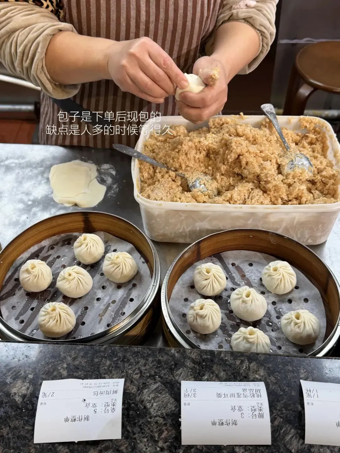 店面藏在公园路中段的老街区里,没有醒目的招牌,只有一扇挂着“手工汤包”木牌的玻璃门,熟客都知道,推开这扇门,就是纯粹的手工香气。店里不大,七八张木质小桌摆得整齐,墙面贴着老顾客的留言便签,老板夫妻俩在后厨忙得有条不紊,擀面、调馅、包汤包的动作一气呵成,全程开放式操作,看得明明白白。