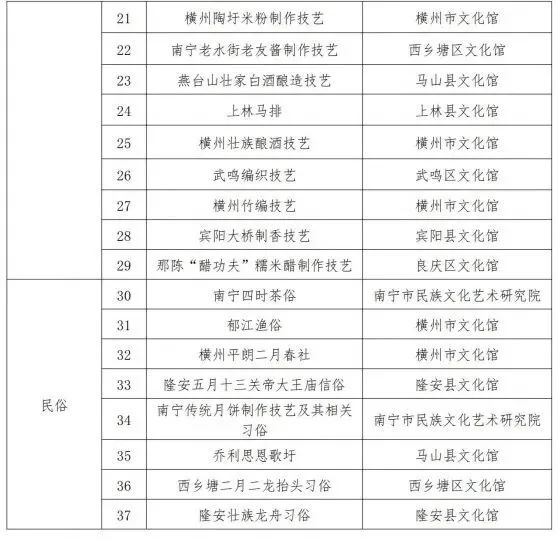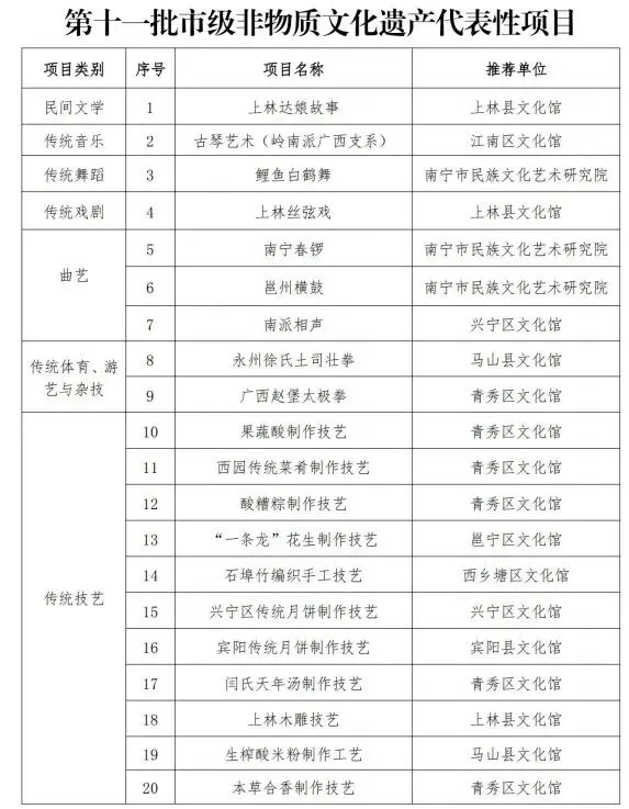 近日,南宁市正式公布第十一批市级非物质文化遗产代表性项目名录。此次入选的非遗项目共计37项,涵盖民间文学、传统音乐、传统舞蹈和传统戏剧各1项,曲艺3项,传统体育、游艺与杂技2项,传统技艺20项,民俗8项,充分展现了南宁非遗保护工作的丰硕成果与地方文化的蓬勃生机。