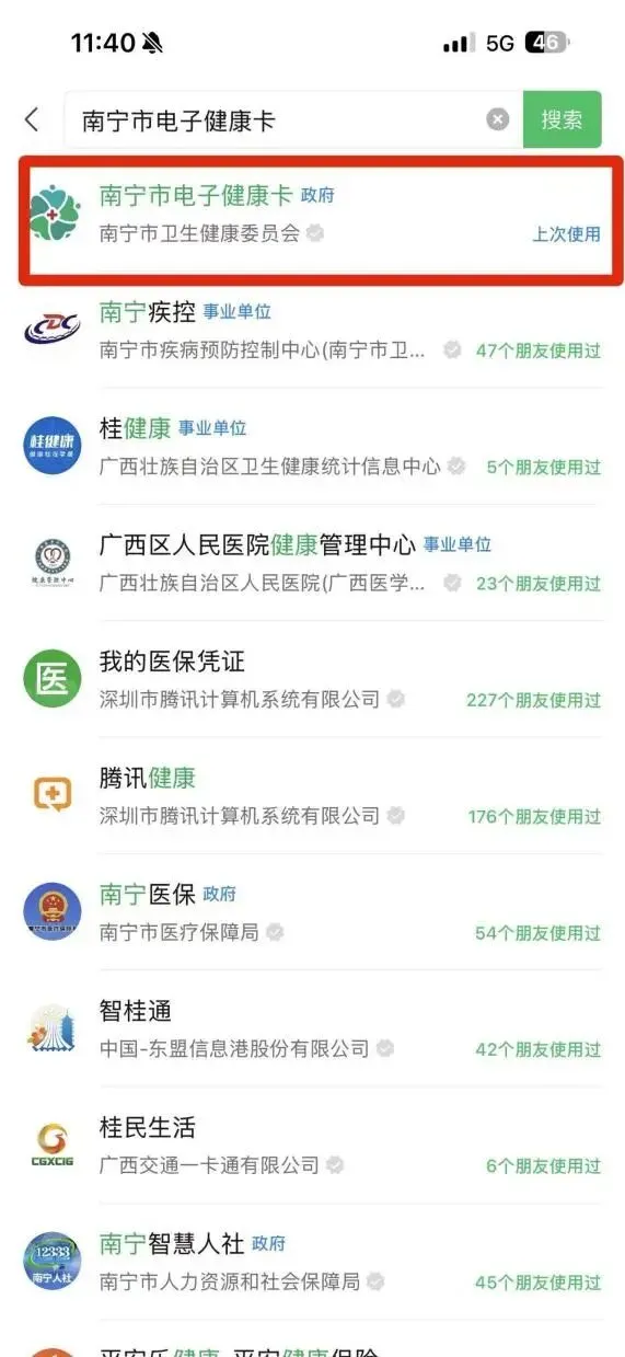 微信搜索“南宁市电子健康卡”小程序,点击进入。
