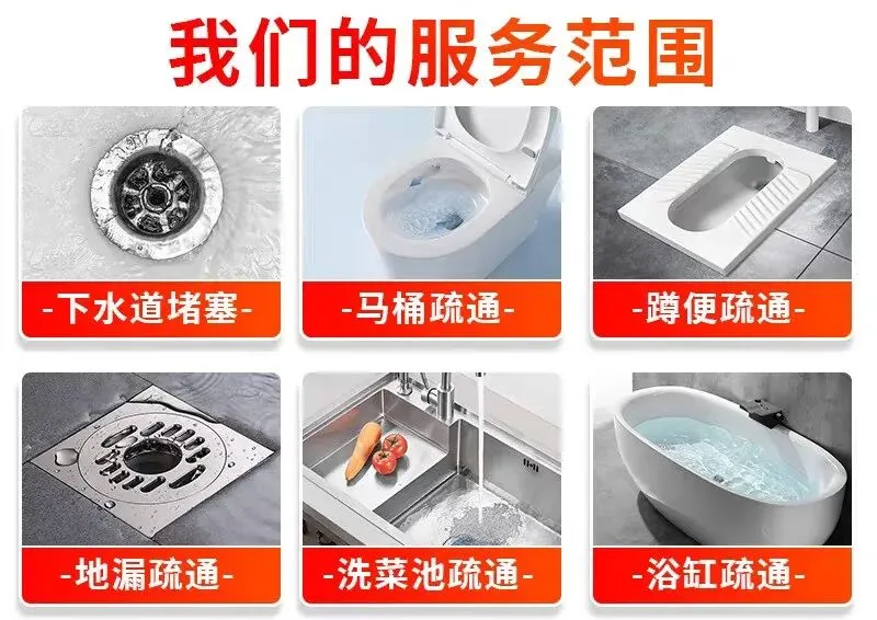 管道疏通:使用专业疏通设备,解决各类下水道、卫生间、地漏、浴缸、菜池、阴沟、马桶、蹲坑等堵塞问题。