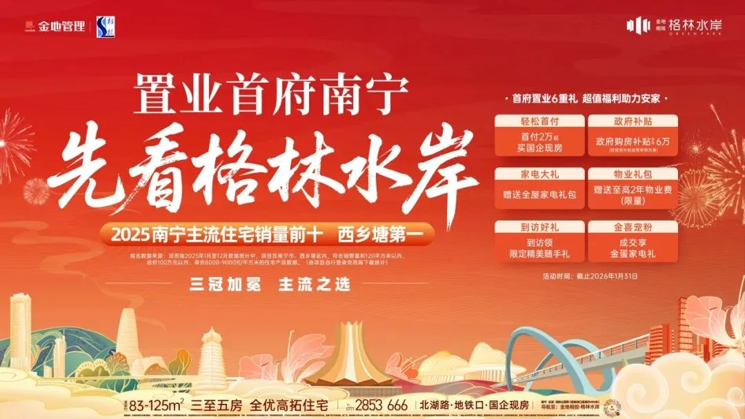 免责声明:1、本宣传资料仅为要约邀请,一切图文资料、规划设计均以政府最终批准文件、商品房买卖合同之约定及实际交付为准。2、本公司保留对宣传资料修改的权利,敬请留意最新资料。3、本宣传资料中对项目周围环境、交通、学校等及其它公共设施的介绍,旨在提供相关信息,不作为本公司的承诺,具体以政府规划及实际实施为准,请客户自行实地考察。4、项目周边教育设施,具体入学条件以教育部门及学校公布的招生政策为准。5、推广名:金地相投·格林水岸;备案名:格林水岸一组团;开发商:南宁华思投资建设有限公司;受托管理方:深圳市金地房地产项目管理有限公司;广告公司:广西凝山科技有限公司;制作时间:2026年1月。6、部分图片、文字及观点,来源于互联网及其他公众平台,主要目的在于分享信息,让更多人获得需要的资讯,版权归原作者所有。如涉及侵权请予以告知,我们会在24小时内删除相关内容。7、我们致力于保护作者版权,转载或引用仅为传播更多信息之目的,部分源自于互联网,如涉及侵权,请联系我们删除,谢谢!8、3号线北湖北路站直距约450米。9、项目周边教育设施,具体入学条件以教育部门及学校公布的招生政策为准。10、数据来源:克而瑞2025年1月至12月数据统计中,项目在南宁市、西乡塘区内,符合销售面积120平方米以内、总价100万元以内、单价8000-9000元/平方米的住宅产品数据。(由项目自行登录克而瑞下载统计)