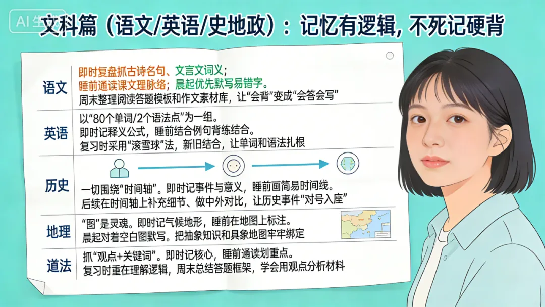 历史:一切围绕“时间轴”。即时记事件与意义,睡前画简易时间线。后续在时间轴上补充细节、做中外对比,让历史事件“对号入座”。