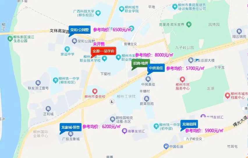 柳东新区近几年基本没有纯新盘入市,目前在售楼盘都在去库存,价格持续触底。去年初板块均价6692元/㎡,今年仅5655元/㎡,直降千元。目前在售主力楼盘荣和·公园墅、中房美佳、龙象城·领誉、龙湖嘉园。