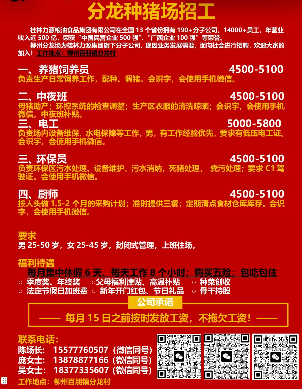 柳州柳江百朋镇分龙新场火热招聘中!!!