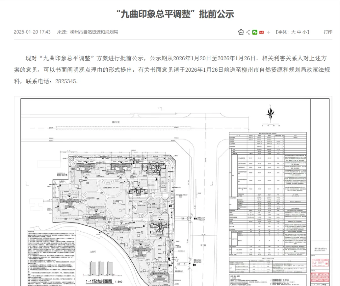 2026年1月20日,柳州市自然资源和规划局发布《“九曲印象总平调整”批前公示》,对九曲印象总平调整方案进行批前公示,公示期从2026年1月20日至2026年1月26日。相关利害关系人对上述方案的意见,可以书面阐明观点理由的形式提出,有关书面意见请于2026年1月26日前送至柳州市自然资源和规划局政策法规科。据了解,九曲印象位于柳州市柳江区柳江大道。项目占地面积39142.11㎡,约合58.71亩,共规划建设10栋高层住宅,2025年10月1日其营销中心刚刚开放。本次九曲印象规划调整主要内容包括部分楼栋的层数减少,包括32层变为17层和32层变为29层,同时还有部分楼栋的楼间距减少等:一、总建筑面积由原126428.43㎡调整为128144.33㎡(增加1715.9㎡),计容面积不变。二、项目规划,调整前后塔楼栋数及楼栋编号均未作改变。三、原总图9#~11#楼T3户型(每层三户)未作改变,仅做户型平面调整;7#~8#楼T2户型(每层二户)未作改变,仅做户型平面调整,层数由32层变为17层;5#楼由T3户型(每层三户)变为T4户型(每层四户),层数由32层变为29层;6#楼由T2户型(每层二户)变为T3户型(每层三户),项目总户数由754户调整为798户,增加44户,建筑立面做相应调整。四、配套公建位置未做调整,因住宅户数、总建筑面积变化,仅根据规划指标要求进行面积调整,老年活动中心由200.65㎡调整为200.08㎡,社区居家养老服务用房由300.34㎡调整为300.01㎡,社区综合服务设施用房由226.39㎡调整为239.89㎡,婴幼儿照护服务用房由151.21㎡调整为159.8㎡,调整后满足规划指标要求。五、7#、8#楼层数由32层变为17层,建筑高度由98.35m调整为53.9m;5#楼层数由32层变为29层,建筑高度由98.35m调整为89.35m;9#楼建筑高度由99.7m调整为98.35m,大门3-2#楼建筑高度由5m调整为8m。七、原批复总图大门高度为5.0米,调整后为8.0米,调整后满足规划退距要求。补充大门坡屋面檐口表达。八、5#楼楼栋位置与6#楼间距由43.40米调整为26.98米,调整后满足规划退距要求。十、9#楼楼栋位置由原距北侧用地红线24.70米调整为35.95米,距离侧用地红线距离不变。十二、11#楼与1#楼间距由33.45米调整为33.55米,与10#楼间距由28.20米调整为30.60米,调整后满足规划退距要求。十三、项目场地内补充地下室出地面进排井、采光井表达。地下室出地面进排井、采光井、楼梯间由102.69㎡调整为564.45㎡。十四、机动车停车位由于总建筑面积、住宅住户变化相应调整,由原总停车位数量932个调整为985个(增加53个);地面机动停位由94个调整为99个,地下停车位由838个调整为886个,地下室范围及大小由25909.11㎡调整为27583.32㎡。十五、非机动车停车位由于总建筑面积、住宅住户变化相应调整,由原总停车位数量1688个调整为1778个(增加90个);地面非机动停车位由606个调整为640个,地下非机动停车位由1082个调整为1138个。—-—这里是信息分割线—-—