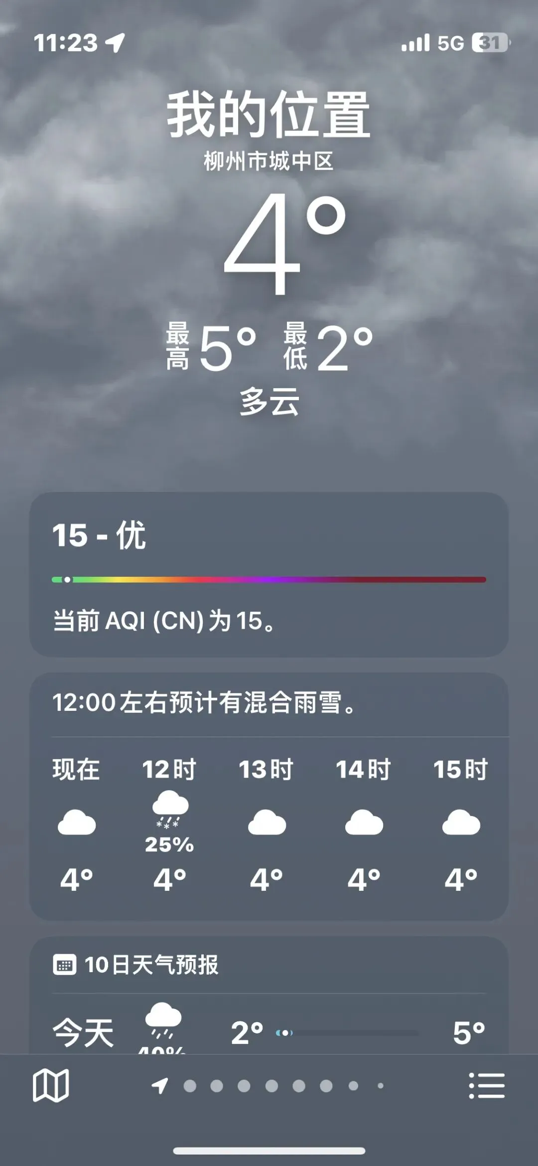 前一天还穿短袖逛柳江,隔天就被4℃湿冷按进羽绒服——柳州的寒潮从不讲“循序渐进”。24小时狂跌17℃,雨雪预警刚弹出,街头已换了模样:行人缩着脖子快步疾行,快递小哥裹紧冲锋衣,帽檐压得极低,冻红的指尖紧握着车把,呼出的白气在冷风中转瞬消散。