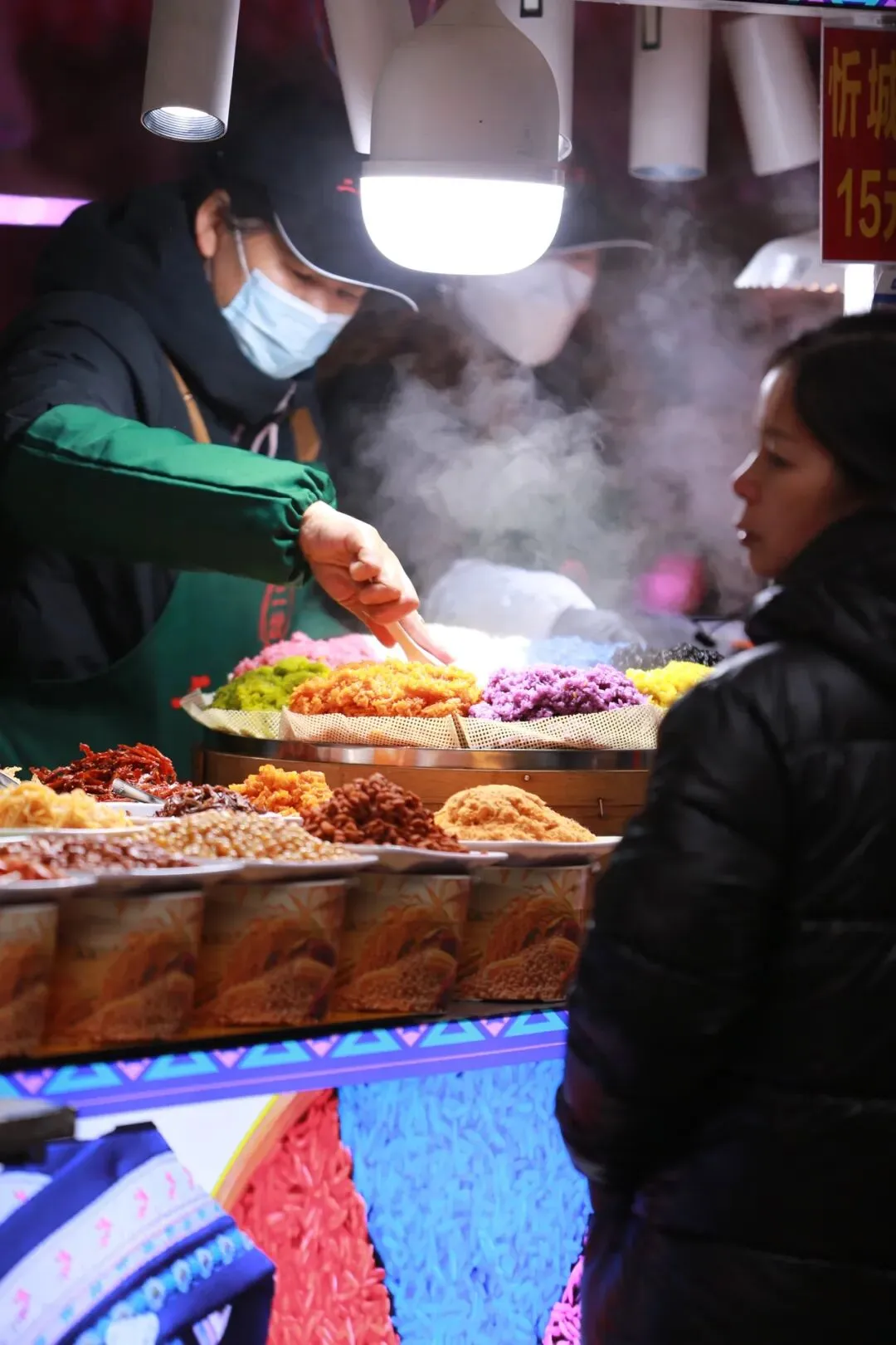 粉摊前热气蒸腾,老板手起勺落,一碗滚烫的螺蛳粉下肚,酸辣鲜香瞬间驱散寒意。年轻情侣在卤味摊前纠结,摊主笑着切了一小块鸭脚让他们试味:“天冷,吃点热的暖身子”。刚送完快递的小哥也钻进早市,接过热粉时,冻得通红的手背还带着风的凉意,喝一口汤,眉头便舒展成满足的笑意。 彩色糯米饭摊的蒸汽在暖黄灯光下升腾成雾。老板戴着口罩,手起勺落间,把紫、橙、绿等颜色鲜亮的糯米饭盛进碗里,热气裹着谷物的甜香扑面而来。穿着厚羽绒服的顾客在摊前驻足挑选,在湿冷的冬夜里,这份色彩斑斓的热乎气,是独属于柳州小吃浪漫与温暖。