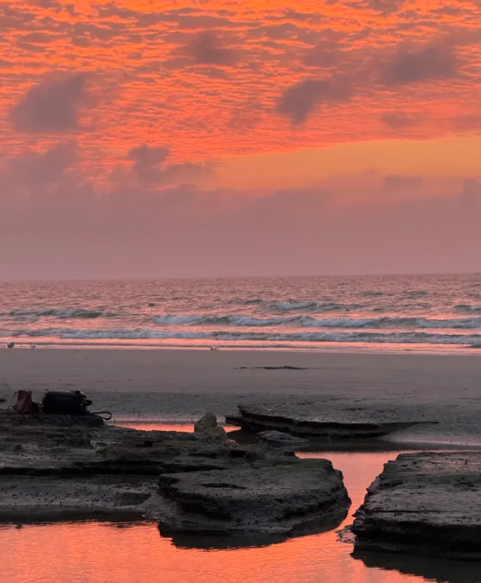 五彩滩看日出,石头有纹,海水退下就露花纹,脚步慢点别滑倒。