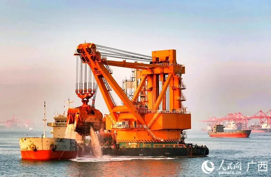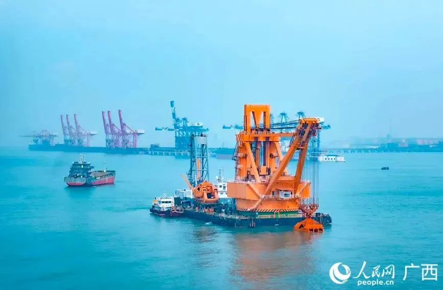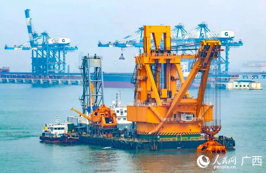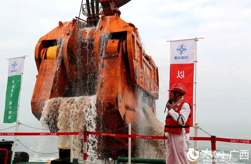 2025年12月底,防城港港口年吞吐量成功突破2亿吨大关,创下历史新高。吞吐量的跨越式攀升,对航道通航能力和基础设施保障水平提出了更高要求。2025年10月,防城港港口30万吨级进港航道扩建工程正式开工,旨在畅通进港航道“大动脉”、提升通航效能,成为释放港口吞吐潜能的“加速器”。由于北部湾是中华白海豚、儒艮等珍稀海洋生物的栖息地,对航道疏浚施工的环保要求极高,此时,中交广航局旗下抓斗挖泥船“金广”正式进场,为交通设施建设与海洋环境保护提供了绿色疏浚的“中交方案”。