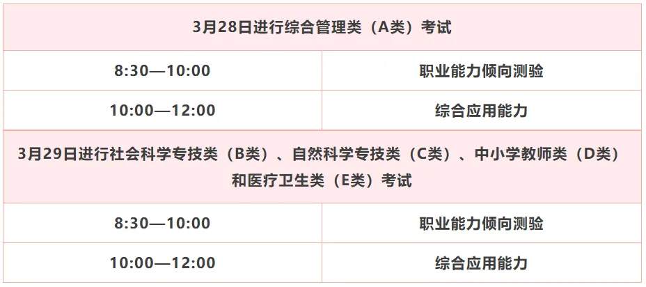 (2)3月29日进行社会科学专技类(B类)、自然科学专技类(C类)、中小学教师类(D类)和医疗卫生类(E类)考试。