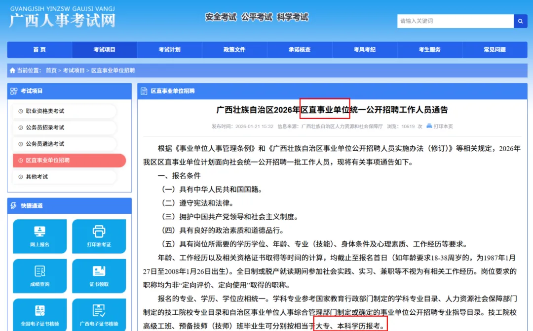 以下内容节选自《广西壮族自治区2026年区直事业单位统一公开招聘工作人员通告》: