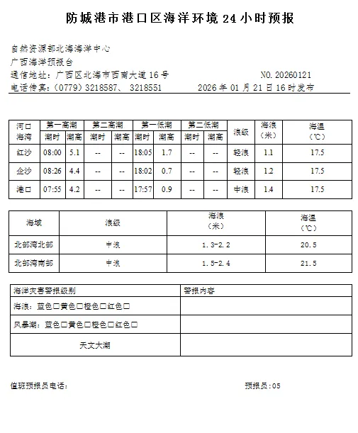>2026年1月21日防城港市港口区海洋环境24小时预报