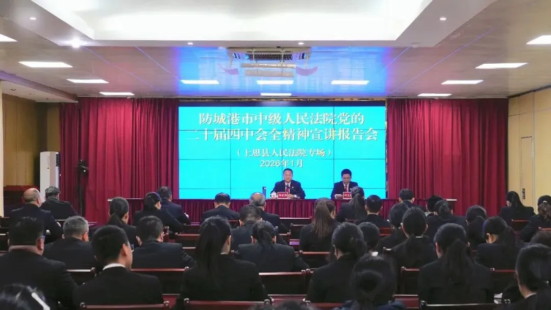 1月20日,防城港市中级人民法院党组成员、副院长李世浩到上思县人民法院,就学习贯彻党的二十届四中全会精神作专题宣讲。宣讲报告会由上思法院党组书记、院长何文强主持,全院干警参加。