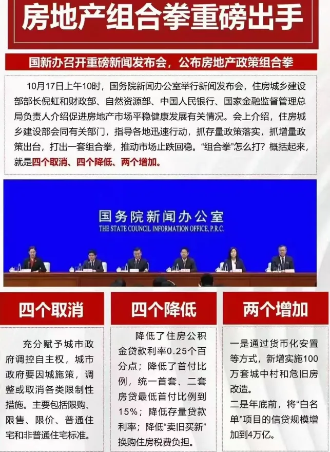 10月17日,国新办就促进房地产市场平稳健康发展有关情况举行发布会,这场会议的信息量很大。会上介绍近期房地产政策“组合拳”的相关内容,包括了“四个取消”“四个降低”,又提出了全新的内容“两个增加”,即: