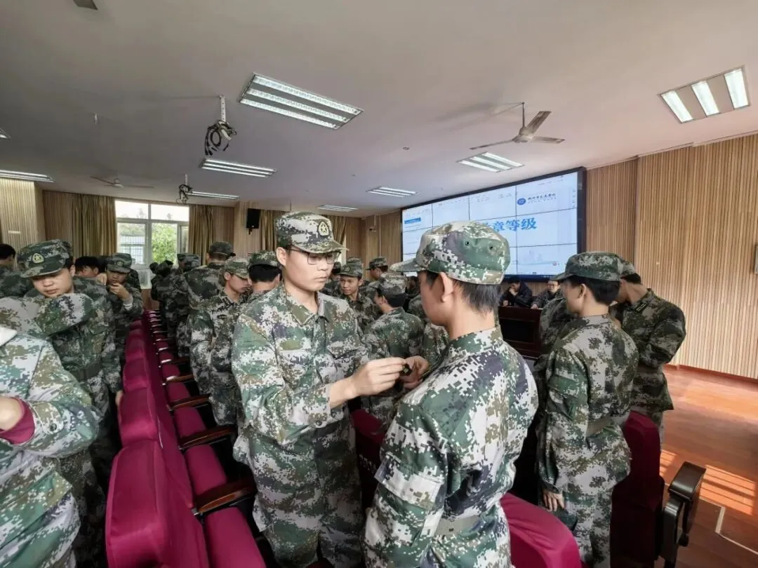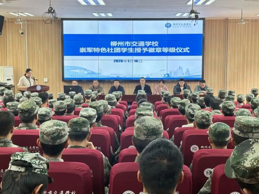 仪式在《中国人民解放军军歌》中拉开序幕,全体人员肃立致敬。主持人罗丹玫依次介绍出席领导与嘉宾,对各方的支持与关注表示诚挚感谢。学保科科长刘沄潇宣读《关于授予柳州市交通学校崇军特色社团学生徽章等级的决定》,授予王睿扬等4名学生排长徽章、覃甘宇等7名学生班长徽章,2024级83名学生获二级徽章,2025级81名学生获一级徽章。学校领导、各支部书记首先为8名学生代表佩戴领章、臂章和姓名牌等标志服饰,每一个授予都饱含期许,每一次握手都传递力量。随后,学生两两一组相互为彼此佩戴徽章,传递责任与使命。授章结束后,在学生代表贾述灿的领誓下,庄严宣誓“我是柳州市交通学校崇军特色社团学员,我宣誓:忠于祖国,热爱人民,永葆赤子之心;严守纪律,听从指挥,锤炼军人品格……”铿锵有力的誓言回荡在报告厅内,既是崇军学子对祖国、对学校的郑重承诺,更是他们砥砺前行、报效国家的决心写照。