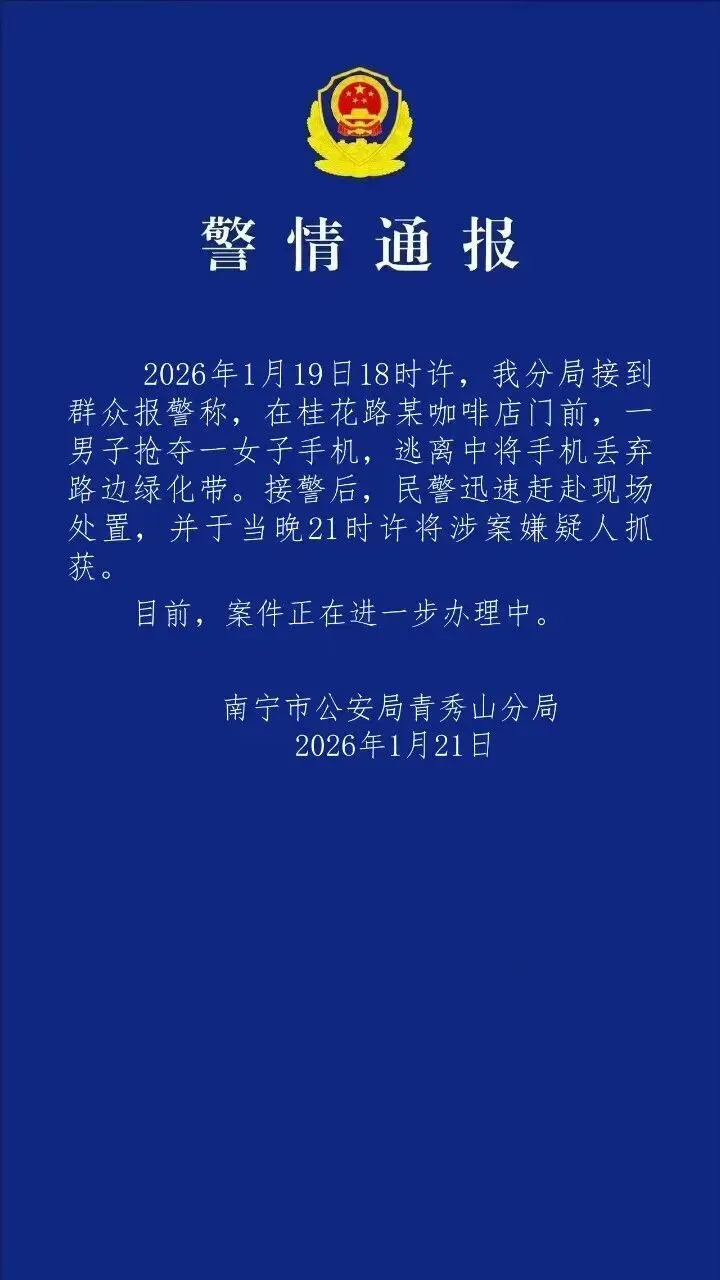 1月19日傍晚,南宁一女子与朋友在一家咖啡店门口拍照时,被一名陌生男子突然抢走手机。咖啡店工作人员称已报警处理。南宁警方通报称,当晚21时许已将涉案嫌疑人抓获。
