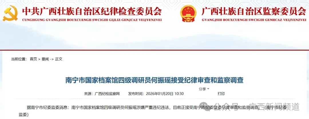 据南宁市纪委监委消息:南宁市国家档案馆四级调研员何振瑶涉嫌严重违纪违法,目前正接受南宁市纪委监委纪律审查和监察调查。