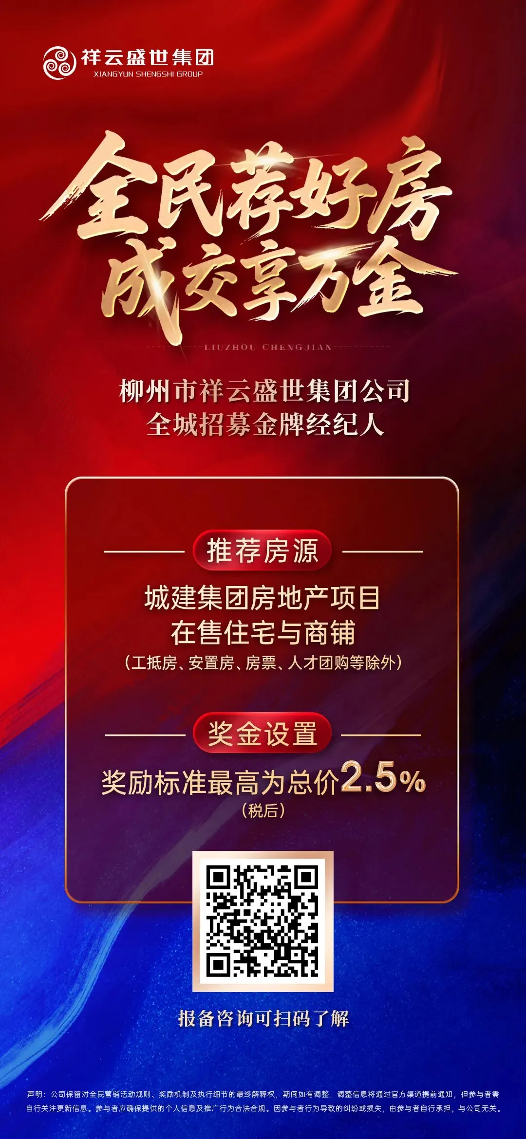以品质赢得赞誉,以诚邀共鉴价值。柳州市祥云盛世投资发展集团有限公司在售住宅及商铺产品目前已启动全民经纪人,全民好礼,荐者有金!