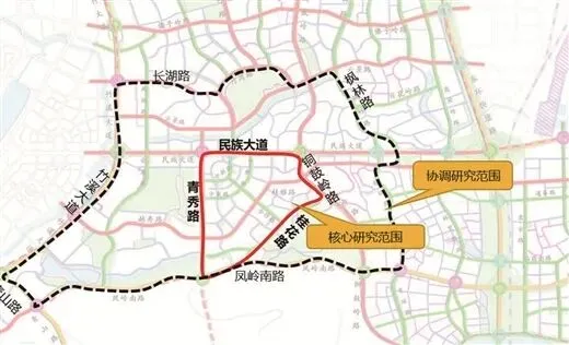 本次规划以民族大道—铜鼓岭路—桂花路—青秀路围合区域为核心范围,协调范围涵盖长湖路—云景路—枫林路—凤岭南路—青山路—竹溪大道围合区域。规划遵循系统协调、互联互通、以人为本、绿色低碳四大原则,聚焦轨道站点服务延伸、交通系统地下化、地下空间集约化三大目标。