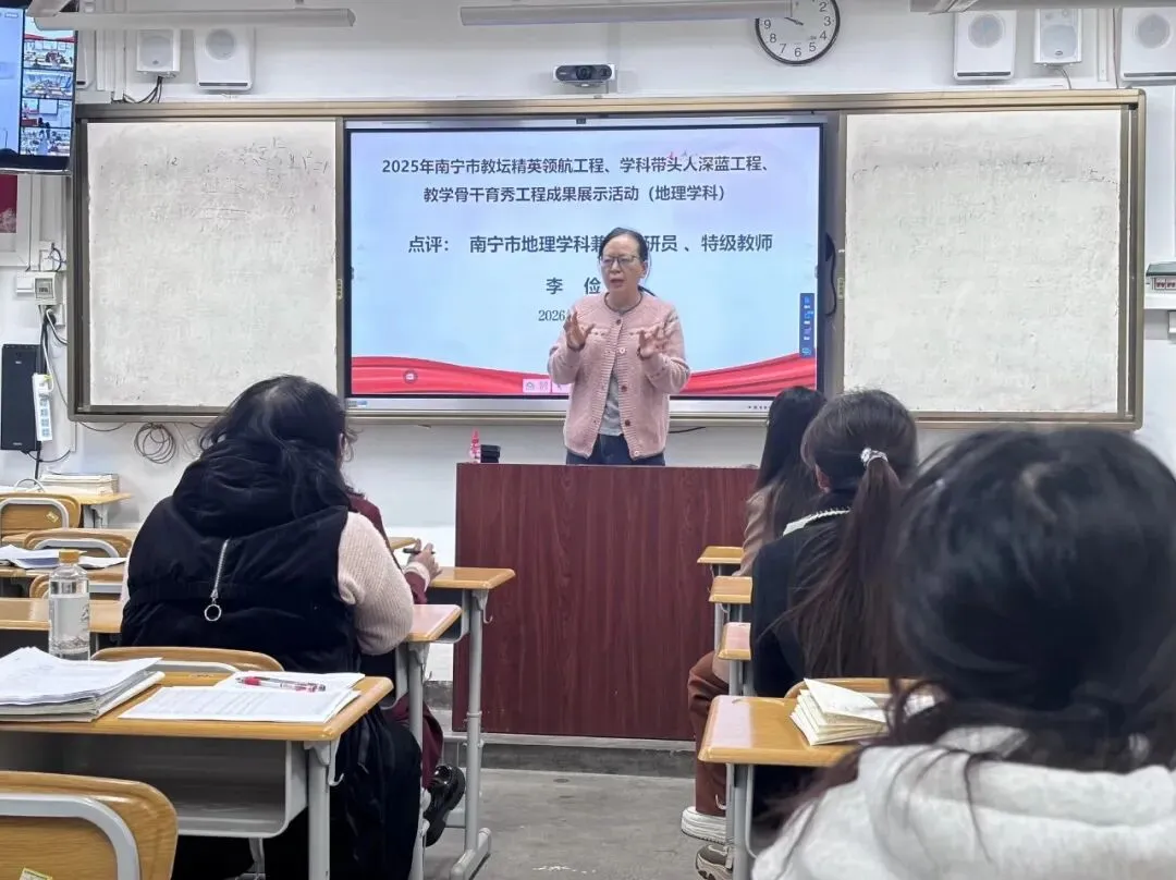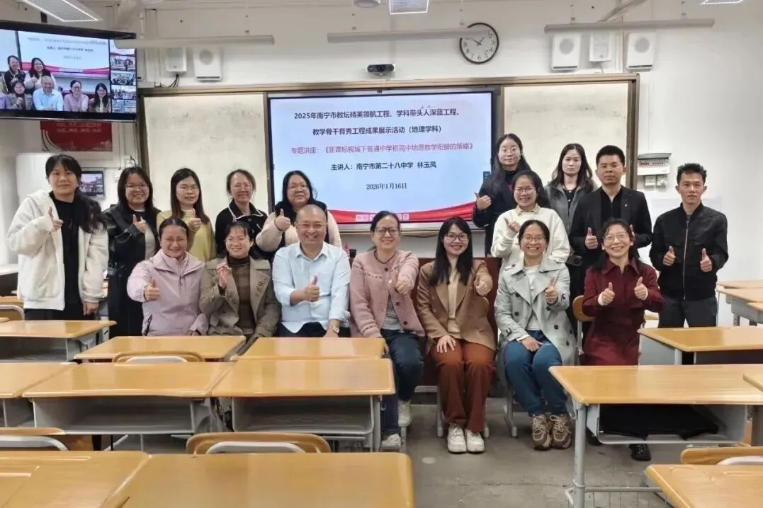 2026年1月16日上午,根据《南宁市教育局关于印发2025年南宁市教坛精英领航工程、学科带头人深蓝工程、教学骨干育秀工程成果展示工作方案的通知》,结合市级规划课题《普通中学初高中地理教学衔接策略的实践研究》研究进展情况,南宁市第二十八中学到南宁市第十三中学开展跨校展示活动和研讨会。本次活动由南宁市第十三中学地理教研组组长余薇老师主持,旨在深入探讨初高中地理教学衔接的有效策略,促进地理教学质量的提升,为学生的地理学习搭建更坚实的桥梁。