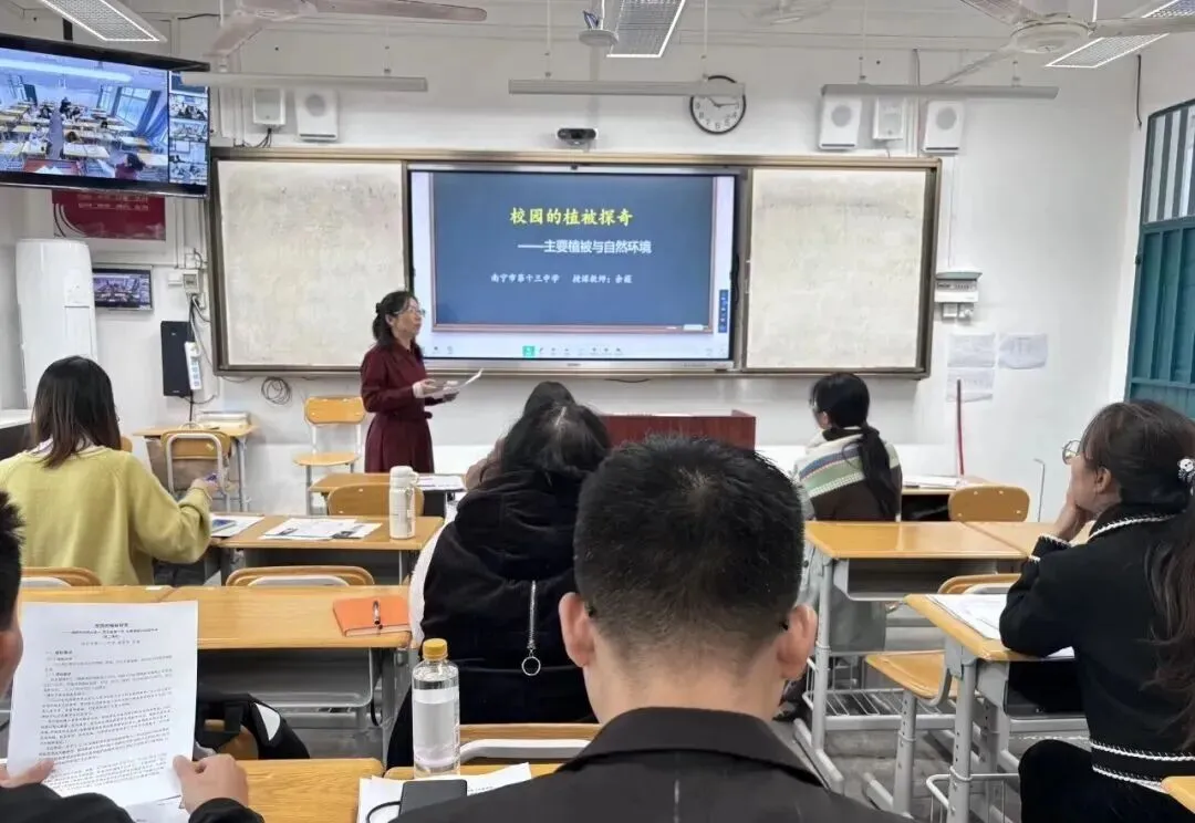 南宁市第十三中学余薇老师的《校园的植被探奇》课例,通过设计问题,检验学生初中相关知识掌握情况、开展校园植被调查、小组课堂分享成果等多样形式,提高学生地理实践力和初高中知识衔接能力,巧妙突破植被相关知识点的学习,结合国家领导人的讲话精神进行核心价值观升华。随后,课题组成员进行磨课,建议围绕课题研究方向,进一步加强体现初高中知识衔接,增加展示环节时间。