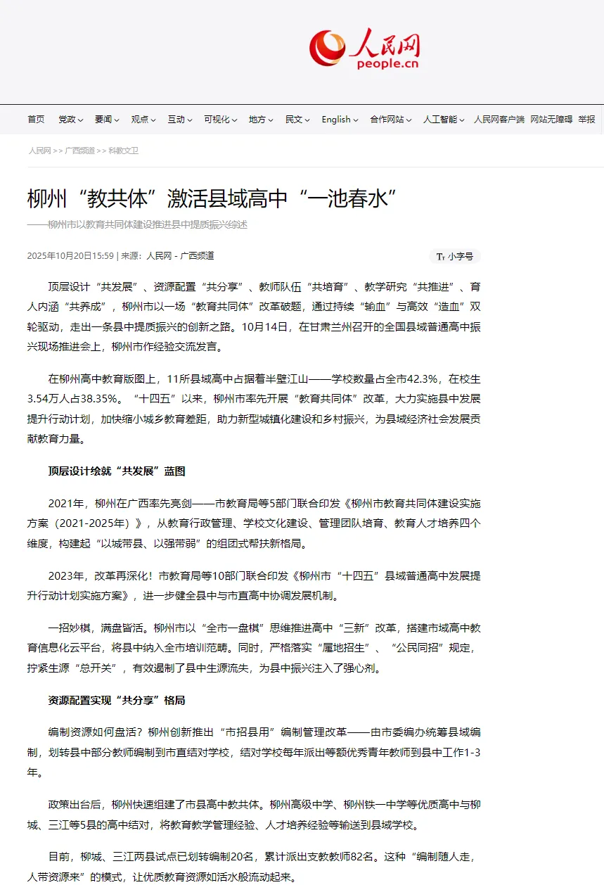 从“有学上”到“上好学”,柳州县域高中正在经历一场美丽蝶变。教育共同体的创新实践,不仅缩小了城乡教育差距,更为县域经济社会发展注入了强劲的教育动能。