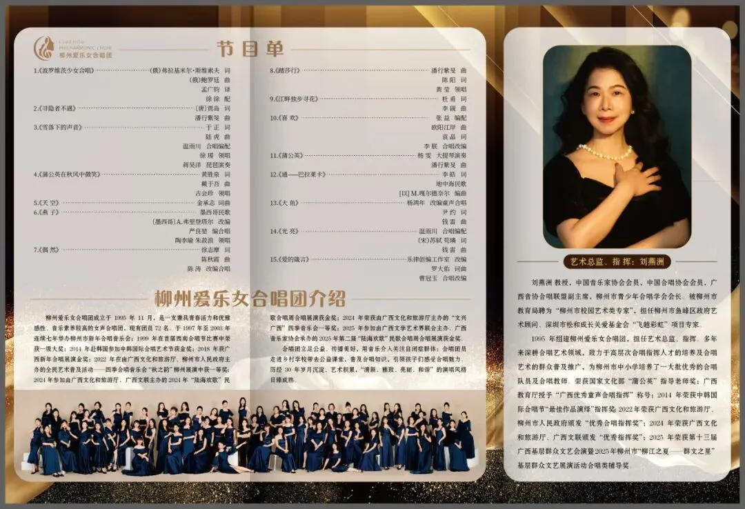 柳州爱乐女合唱团成立于1995年11月,是一支兼具青春活力和优雅感性、音乐素养较高的女声合唱团,现有团员72名。于1997年至2003年连续七年举办柳州市新年合唱音乐会;1999年在首届西南合唱节比赛中荣获一级大奖;2014年赴韩国参加中韩国际合唱艺术节获金奖;2018年获广西新年合唱展演金奖;2022年在由广西文化和旅游厅、柳州市人民政府主办的全民艺术普及活动——四季合唱音乐会“秋之韵”柳州展演中获一等奖;2024年参加由广西文化和旅游厅、广西文联主办的2024年“陆海欢歌”民歌合唱周合唱展演获金奖;2024年荣获由广西文化和旅游厅主办的“文兴广西”四季音乐会一等奖;2025年参加由广西文学艺术界联合主办、广西音乐家协会承办的2025年第二届“陆海欢歌”民歌合唱周合唱展演获金奖。