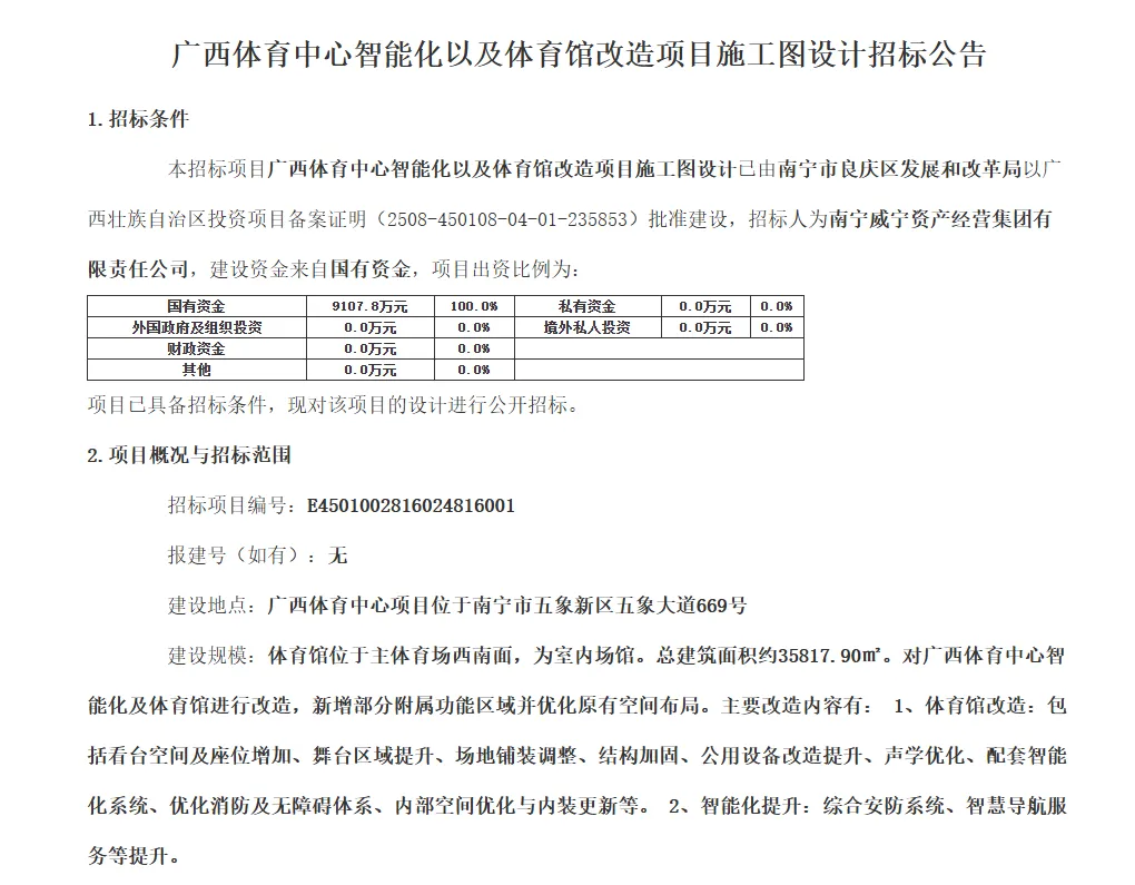 其一,广西体育中心智能化以及体育馆改造项目施工图设计已由相关部门批准建设,招标人为南宁威宁资产经营集团有限责任公司,项目建设出资高达9107.8万元;