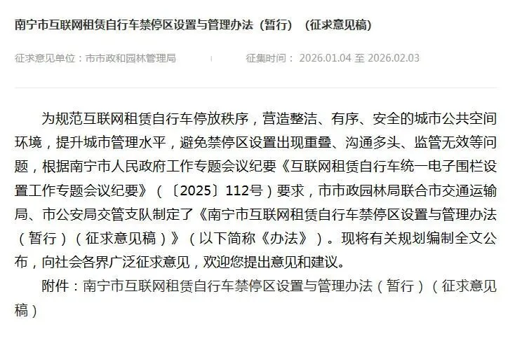 今年1月初,南宁市市政和园林管理局发布《南宁市互联网租赁自行车禁停区设置与管理办法(暂行)(征求意见稿)》(以下简称《办法》),这份文件首次系统性地划定了共享自行车(含电动自行车)的“长期禁停区”与“临时禁停区”,并明确具体地点、距离数值及动态调整机制。