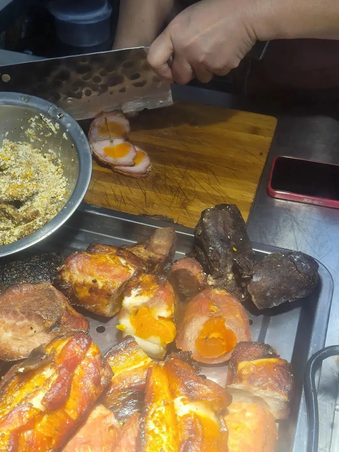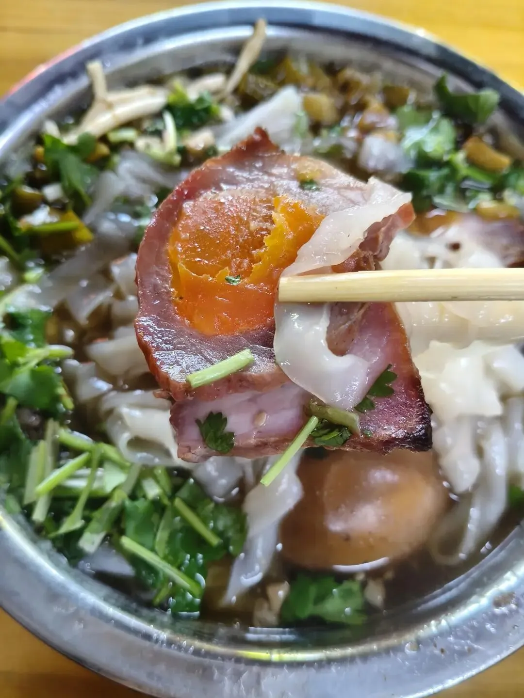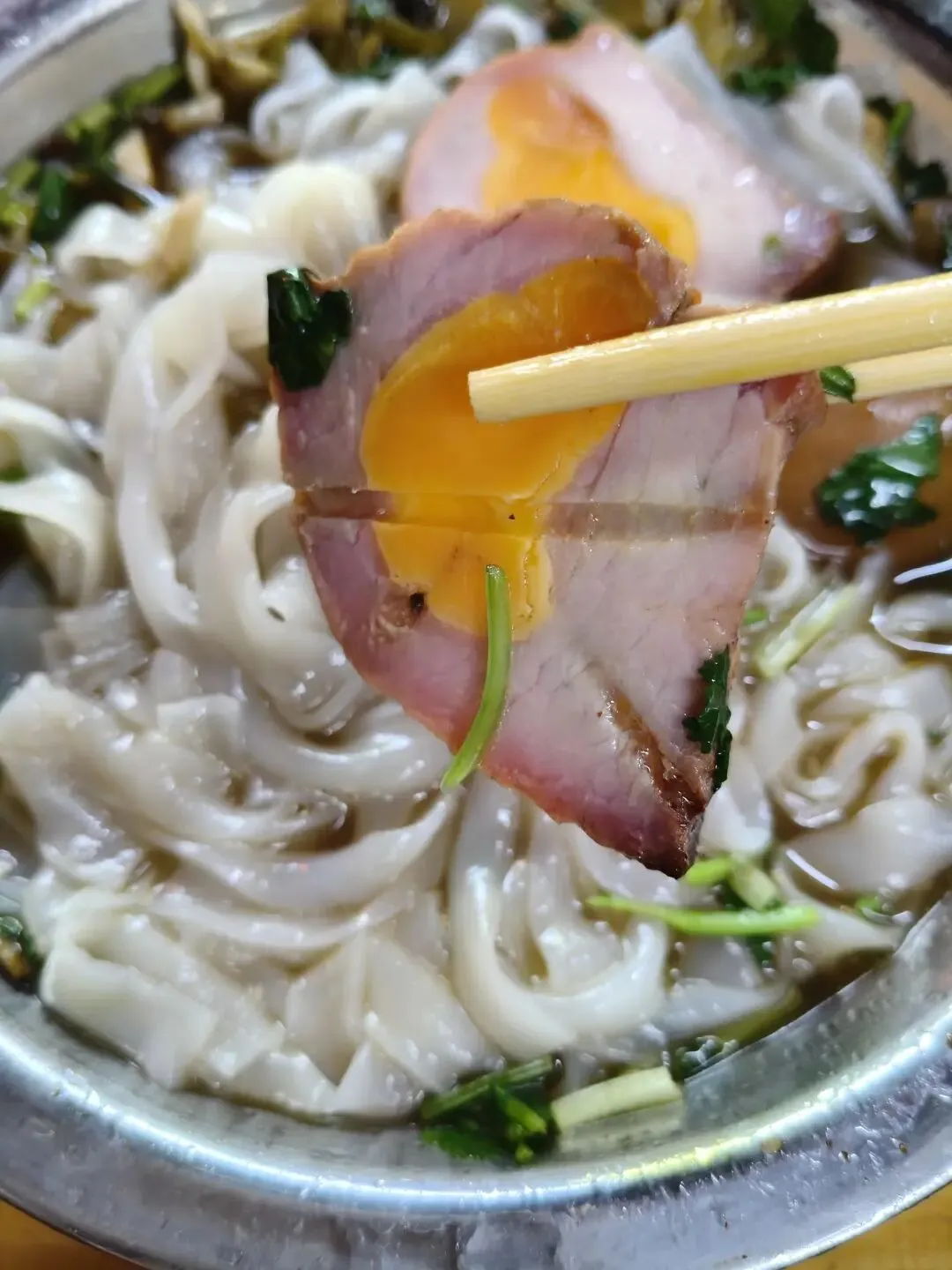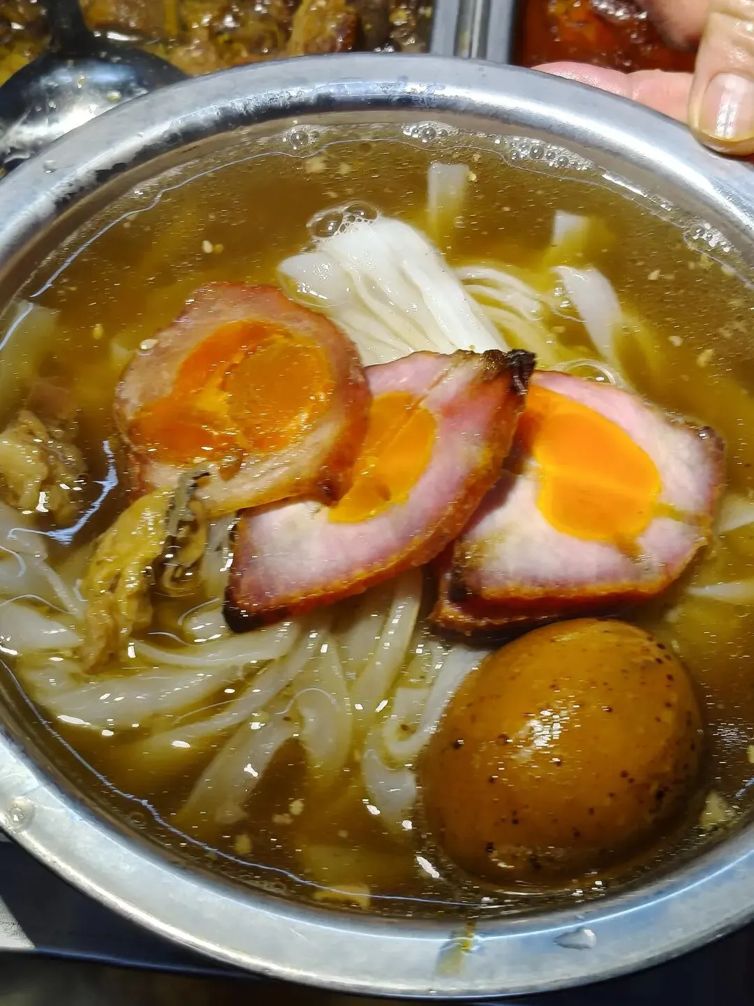 柳州本地的圆粉吸饱了汤汁,Q弹爽滑,用筷子夹起一大口嗦进嘴里,米香混合着汤鲜在舌尖炸开,口感绝了!牛腩炖得软烂入味,轻轻一咬就脱骨,肉质紧实却不柴,每一丝纤维都浸满了汤汁的鲜香;卤蛋更是惊喜,蛋白Q弹有嚼劲,蛋黄吸足了卤汁,咸香四溢,越嚼越有味道。最绝的还是咸蛋黄叉烧!肥瘦相间的叉烧肉烤得外皮微焦,带着淡淡的蜜香,包裹着沙糯流油的咸蛋黄,咸甜交织的口感层层递进,和鲜醇的汤底、Q弹的米粉搭配在一起,每一口都让人直呼满足,幸福感爆棚。