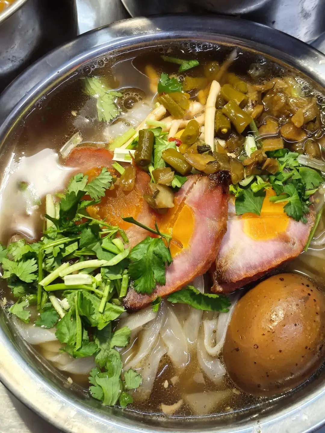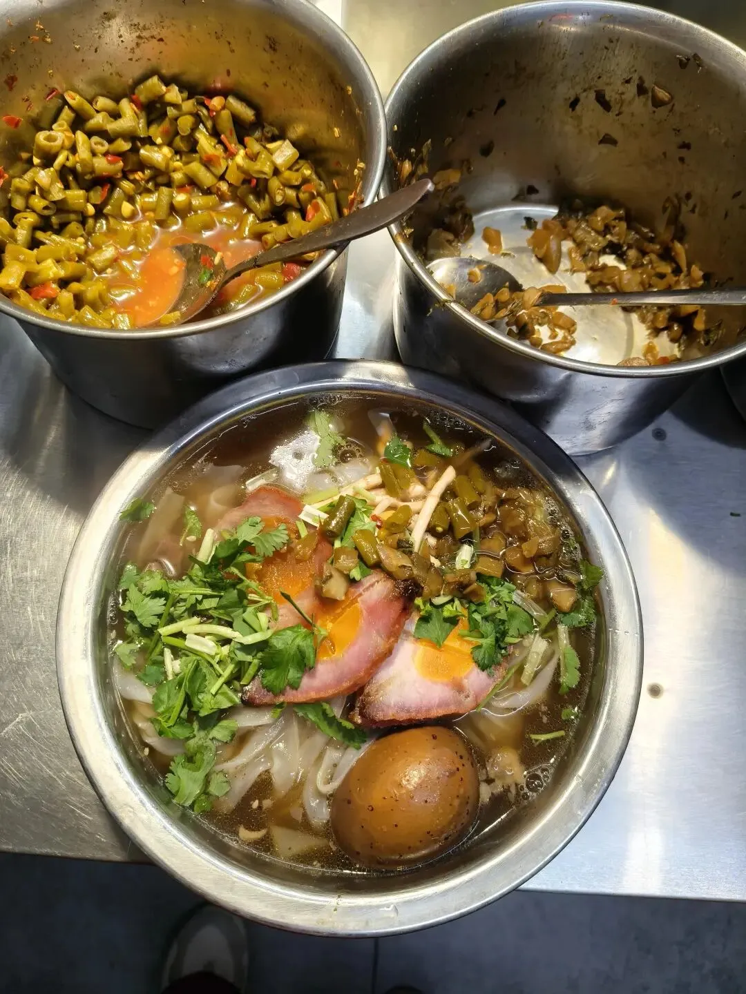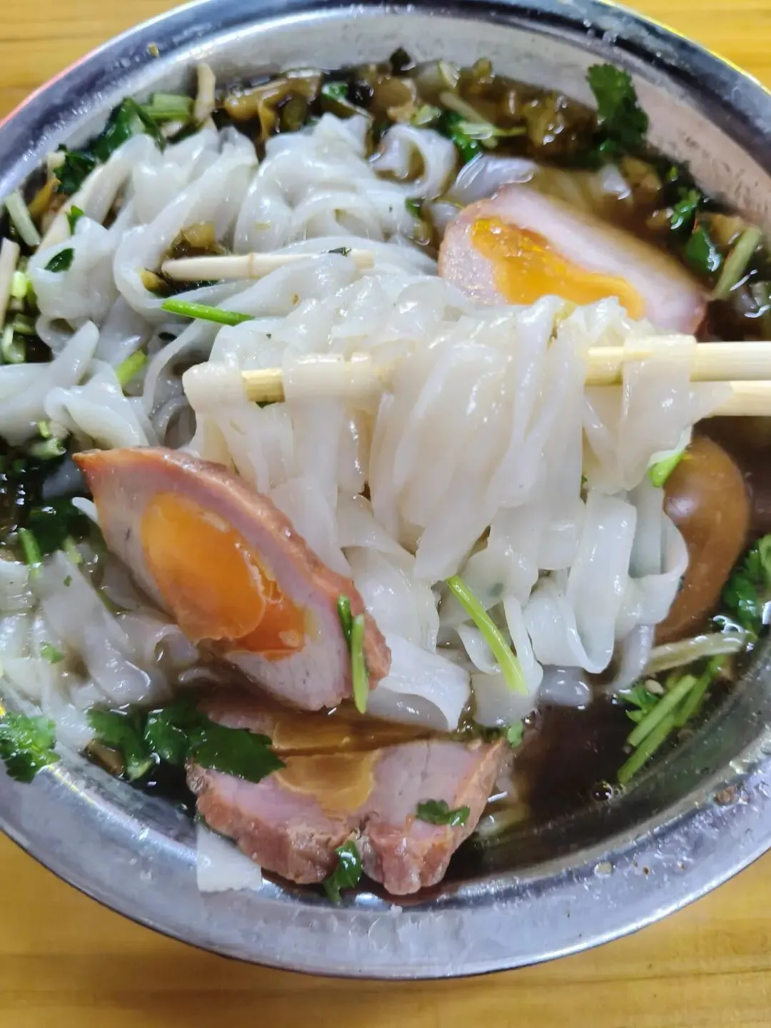 店里的食客大多是附近的老居民,有带着孙子来吃的奶奶,有下班顺路打卡的打工人,大家边吃边和老板唠家常,氛围热闹又亲切。老板娘看到我汤快喝完了,还主动问要不要免费加汤,热情得让人心里暖暖的。一碗粉加叉烧加卤蛋才二十出头,分量足到吃撑,性价比直接拉满。