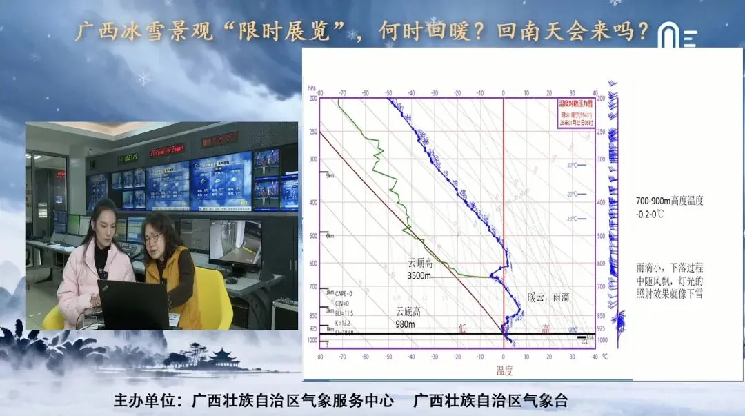 1月22日上午,广西气象台首席预报员农孟松介绍:昨天以来,南宁最低气温3-5度,并伴随降水,南宁气象台的探空气球监测到在南宁上空确实有一层比较厚的云,但云的温度在0度以上,所以并不存在降雪的条件,网友拍到的视频,有可能毛毛雨的雨滴在灯光照射下的视觉效果。