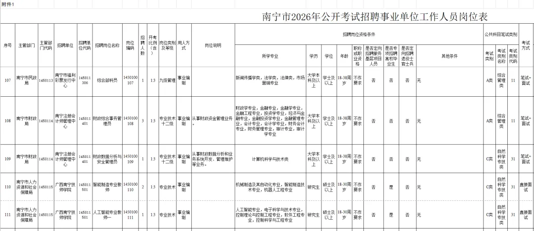 附件:1.南宁市2026年公开考试招聘事业单位工作人员岗位表