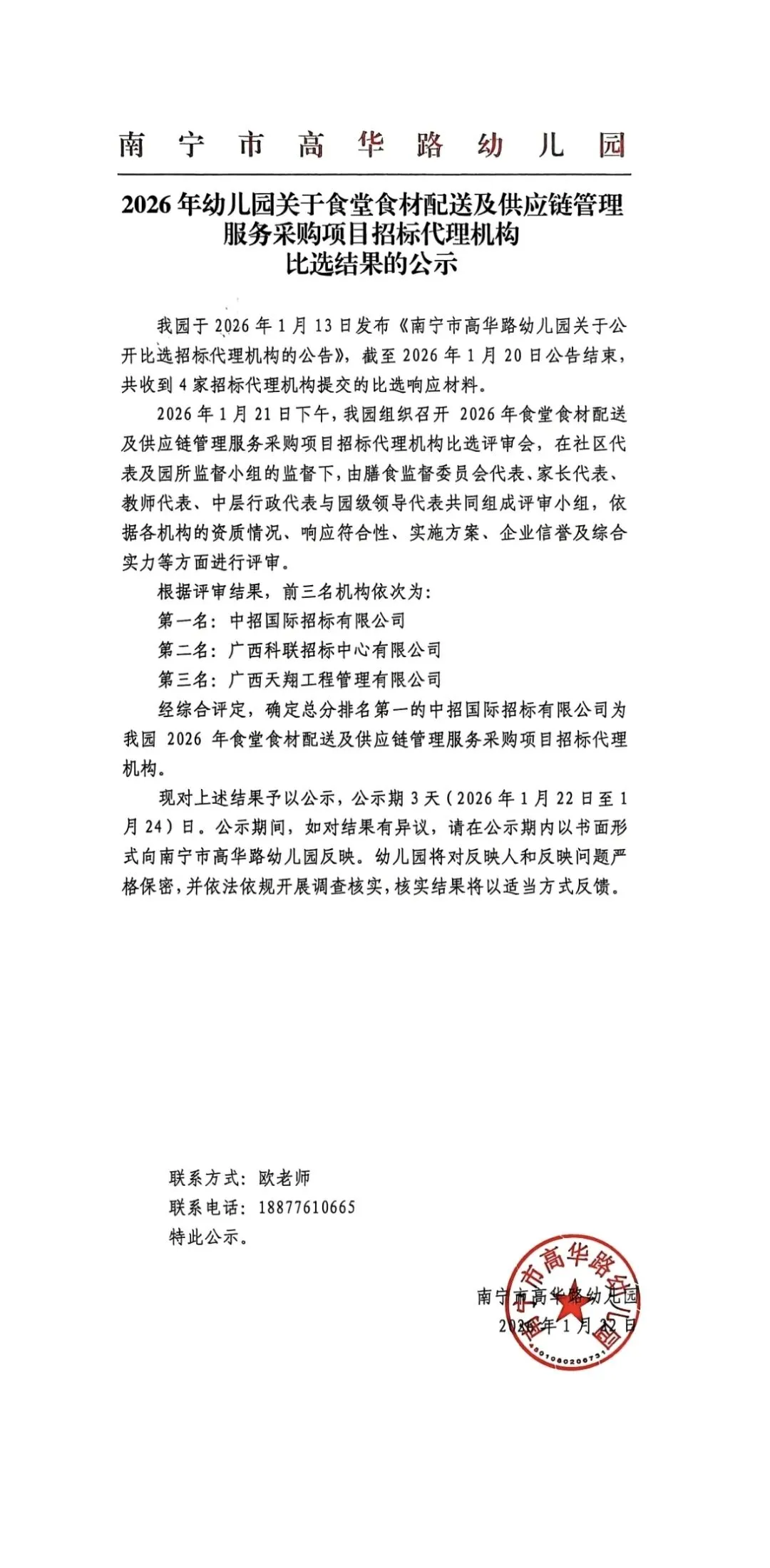 >南宁市高华路幼儿园2026年食堂食材采购项目招标代理机构比选结果公示