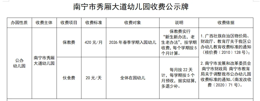 根据相关文件规定,南宁市秀厢大道幼儿园2026春季学期收费4300元/学期,收费标准如下: