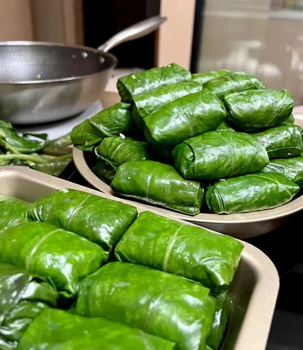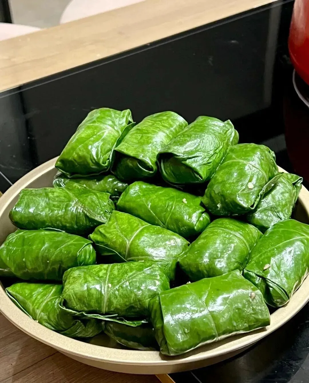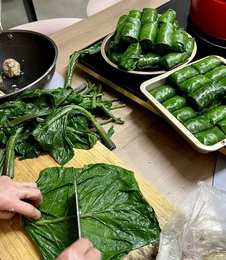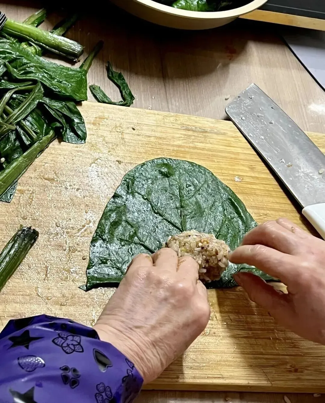 然后用洗干净的菜叶子一包 , 软软糯糯的米饭裹在清香的叶子里 , 咬一口下去 , 叶子的清香和糯米的油香混在一起。