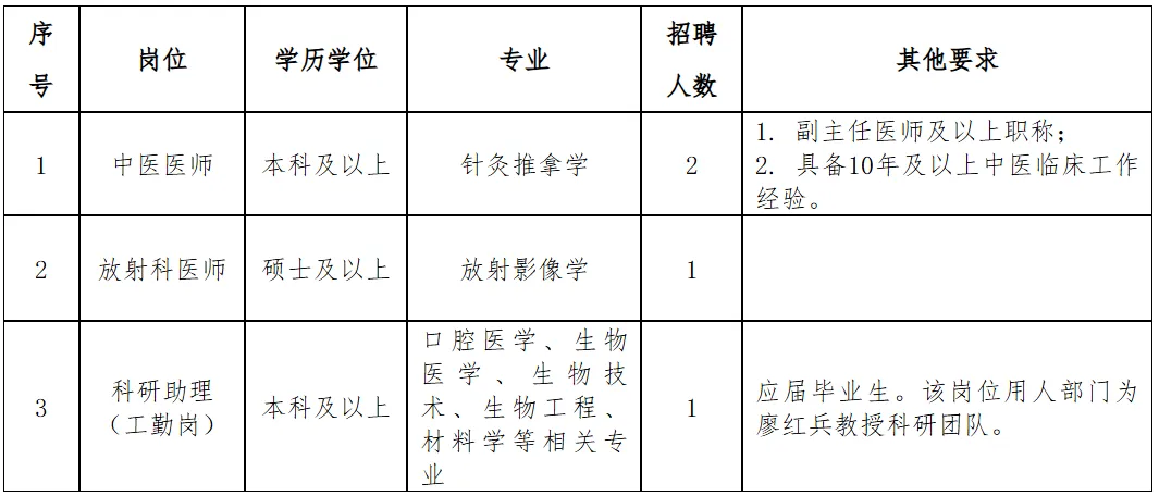 根据我院工作需要,现面向社会公开招聘医师、科研助理等岗位人才4名,现将有关事项公告如下: