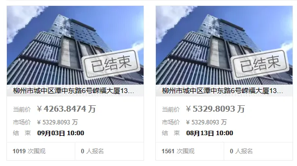 本次即将启动装修招标的嵘福大厦13-16层曾在2025年上过两次法拍平台,首次起拍价5329.8093万元,第二次起拍价为4263.8474万元,但即便降价了1065.9619万元还是没能成交。